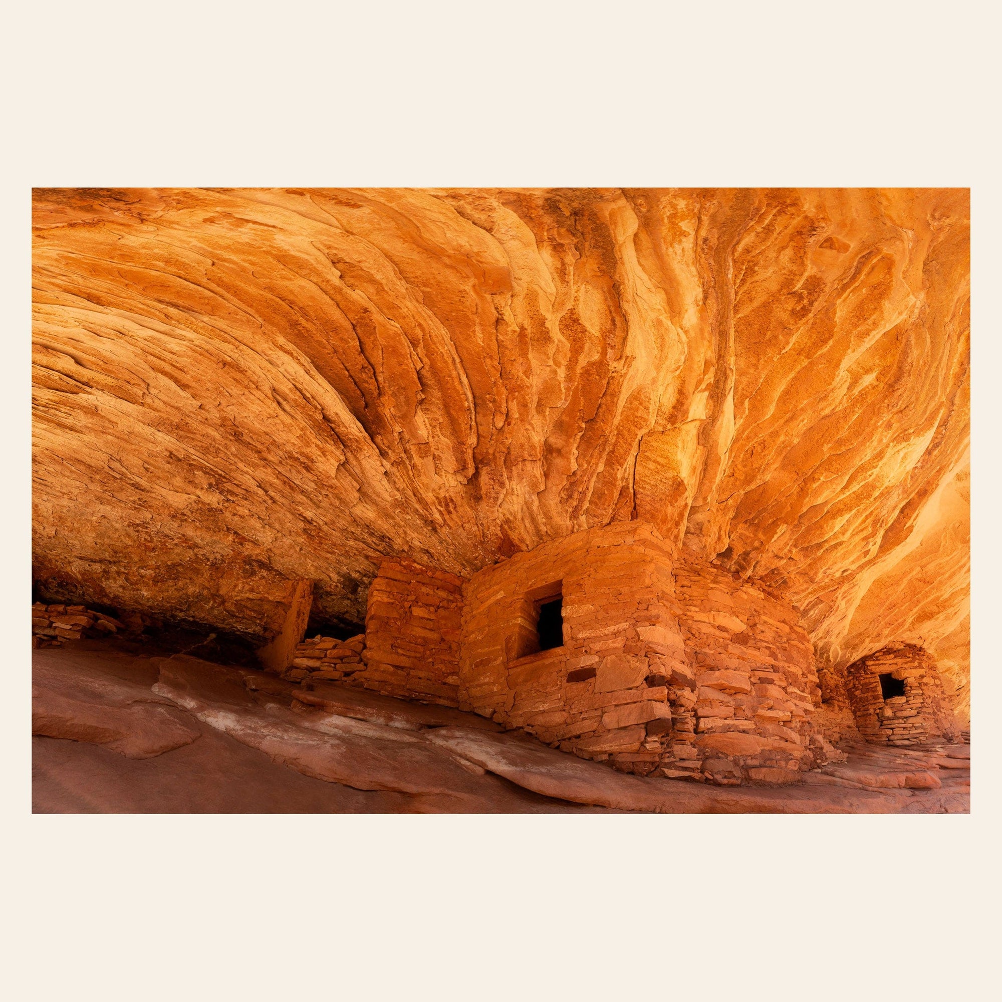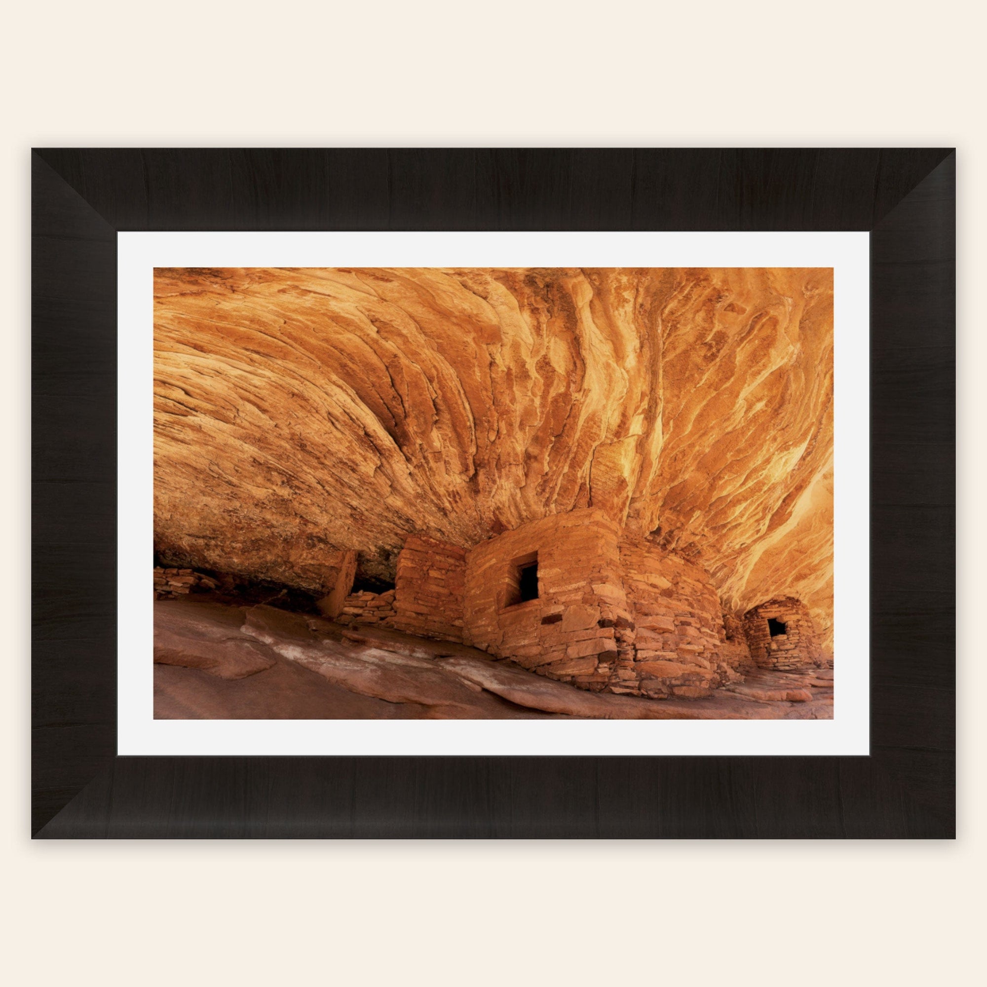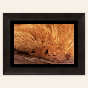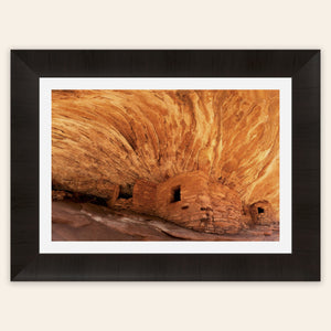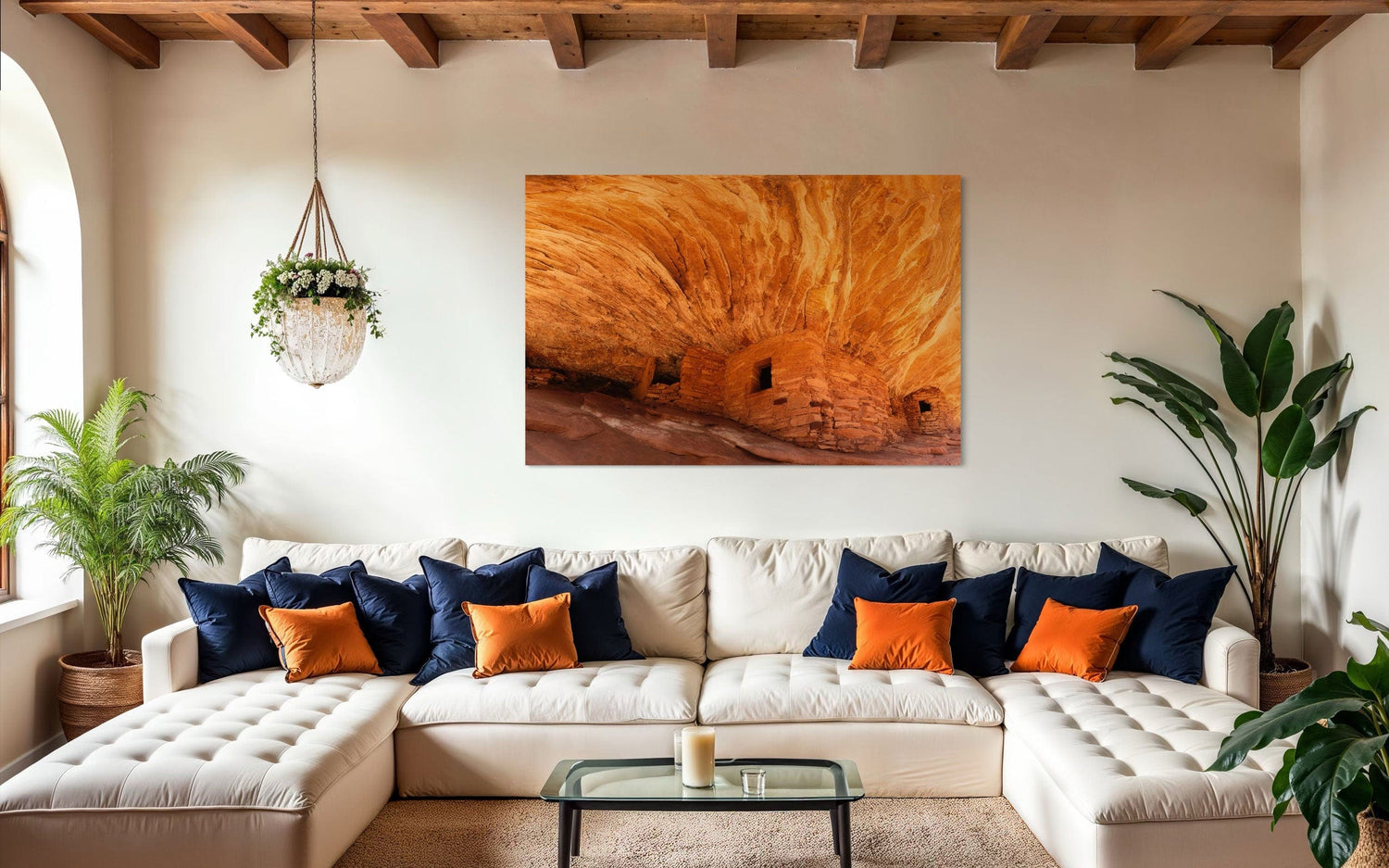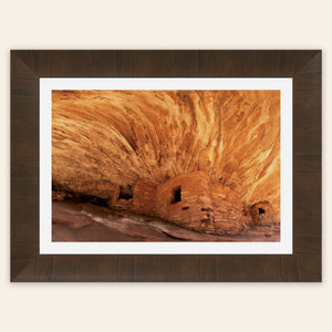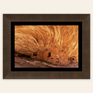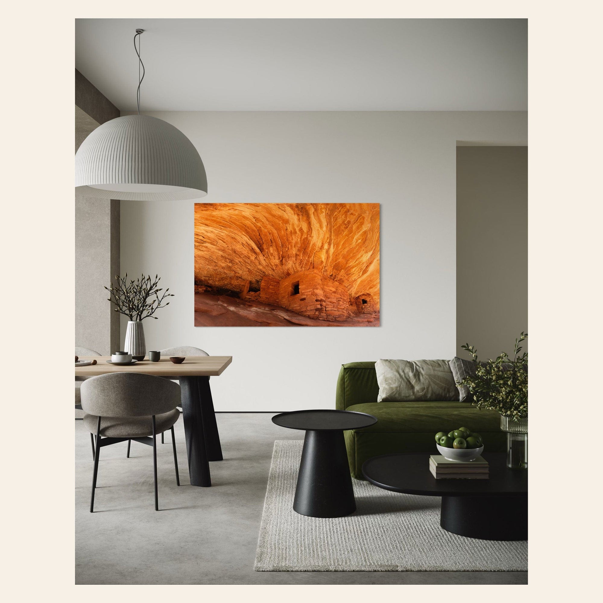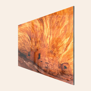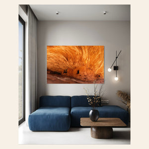 A piece of Utah art showing a photo of the House on Fire ruins in Bears Ears Monument hangs in a living room.