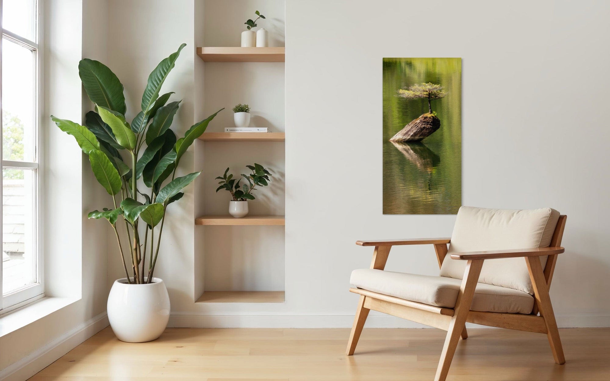 A piece of Pacific Northwest art showing a Bonsai photo from Vancouver Island hangs in a sitting area.