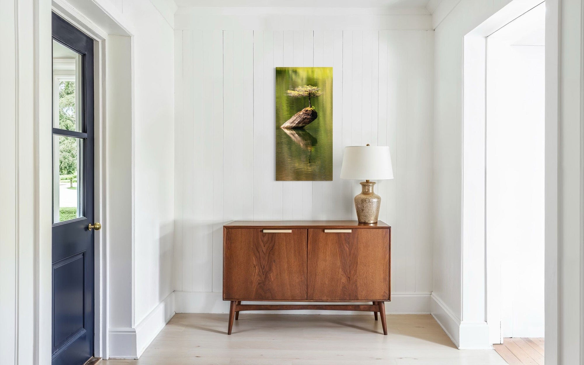 A piece of Pacific Northwest art showing a Bonsai photo from Vancouver Island hangs in an entryway.