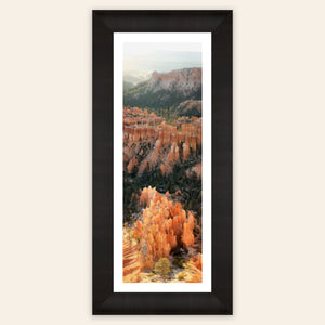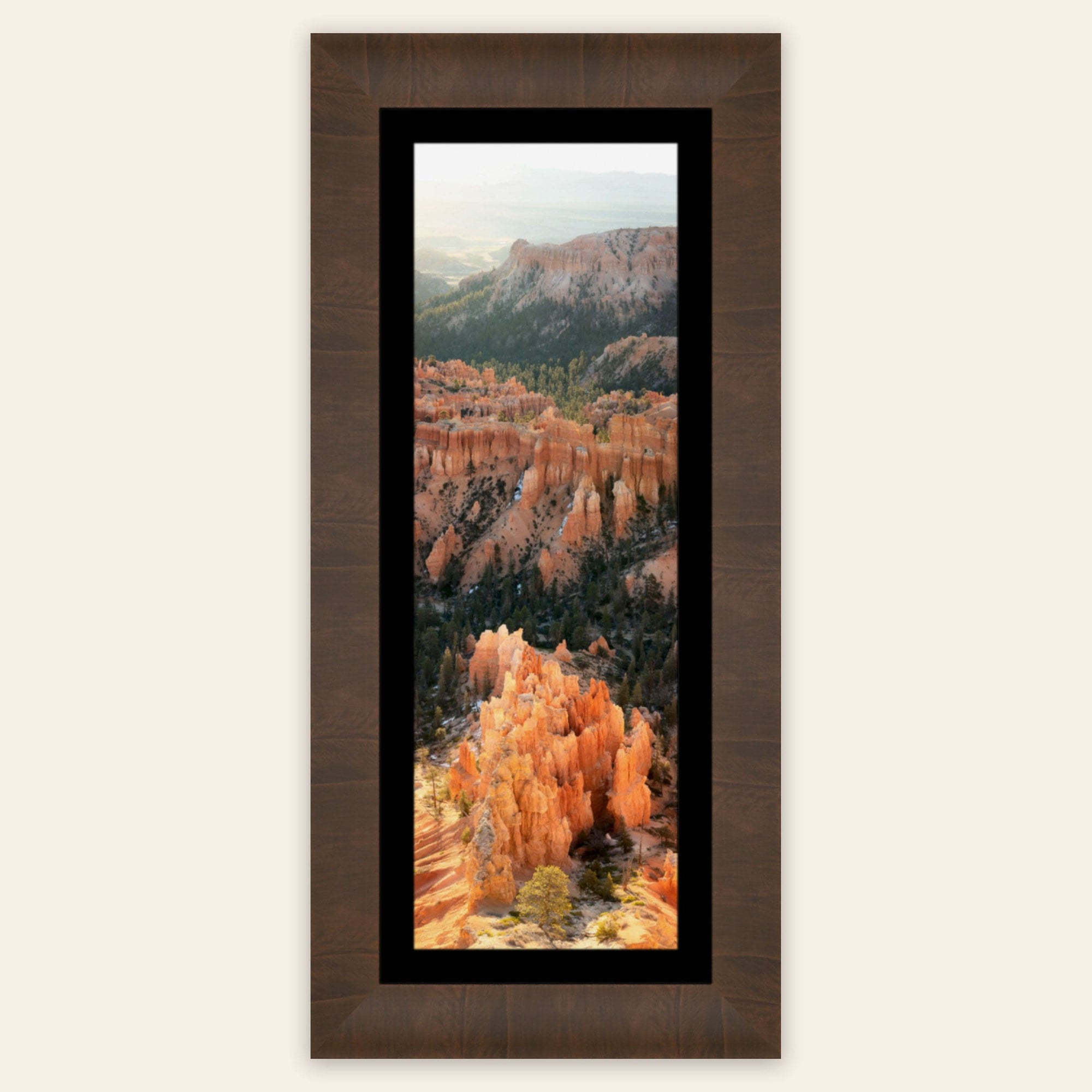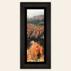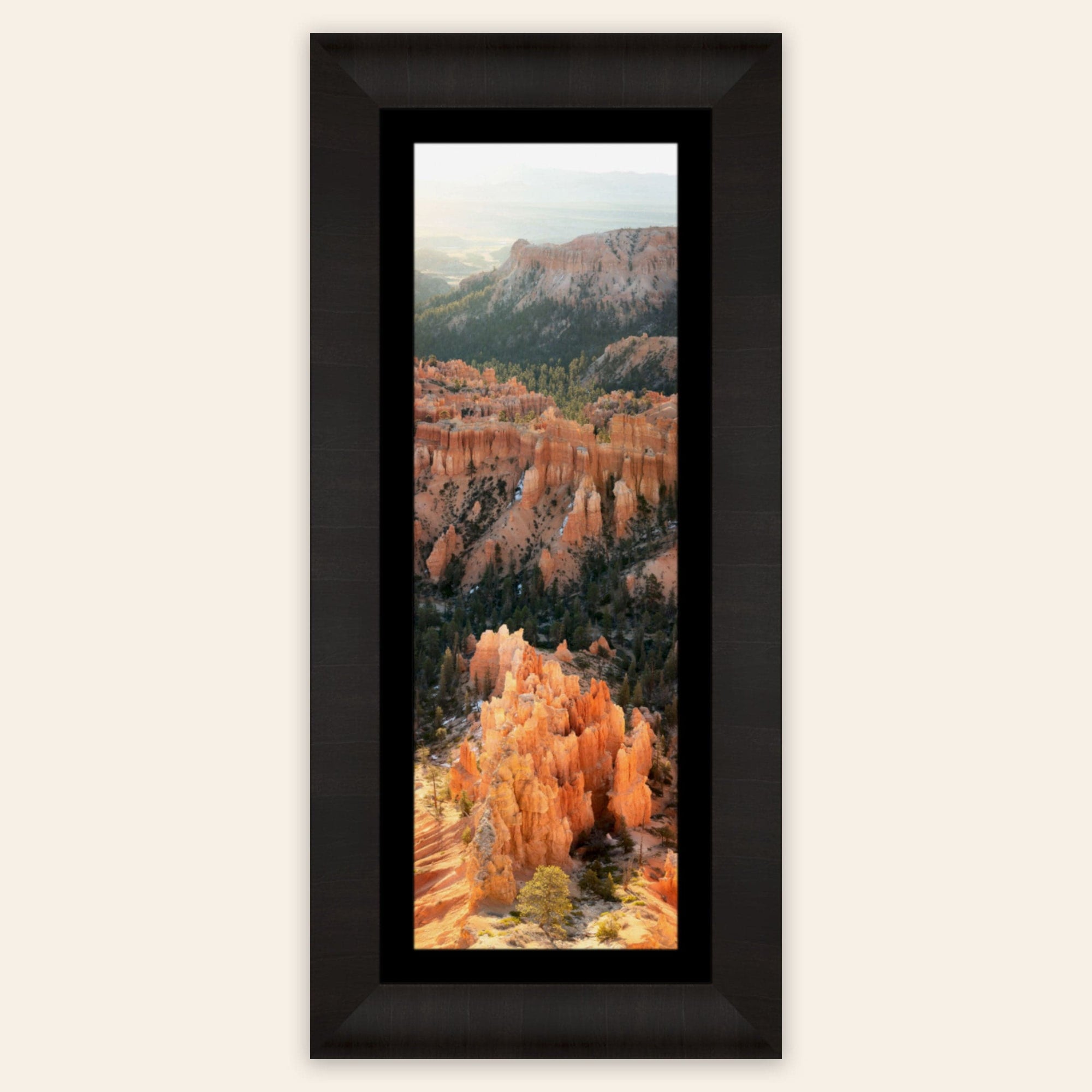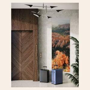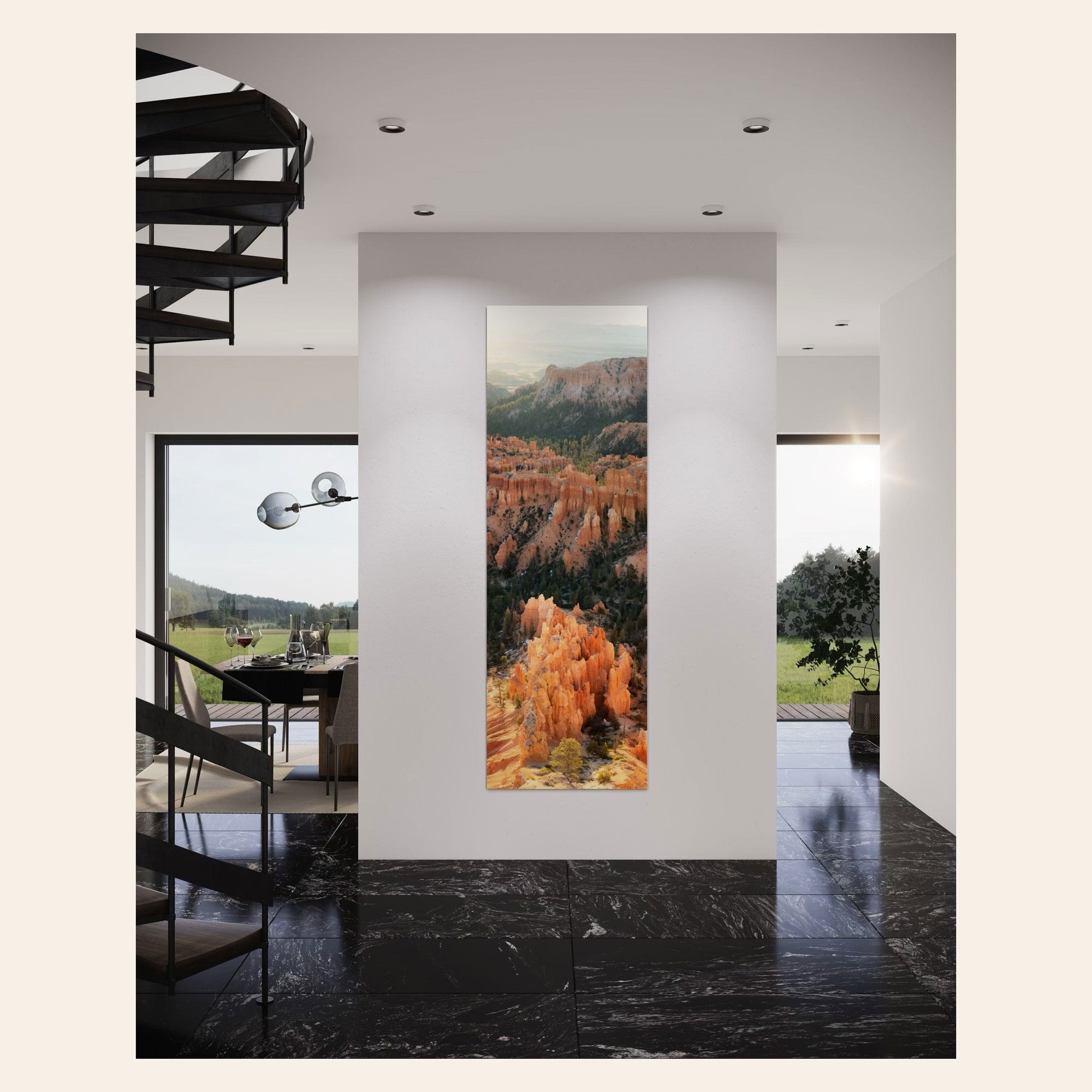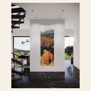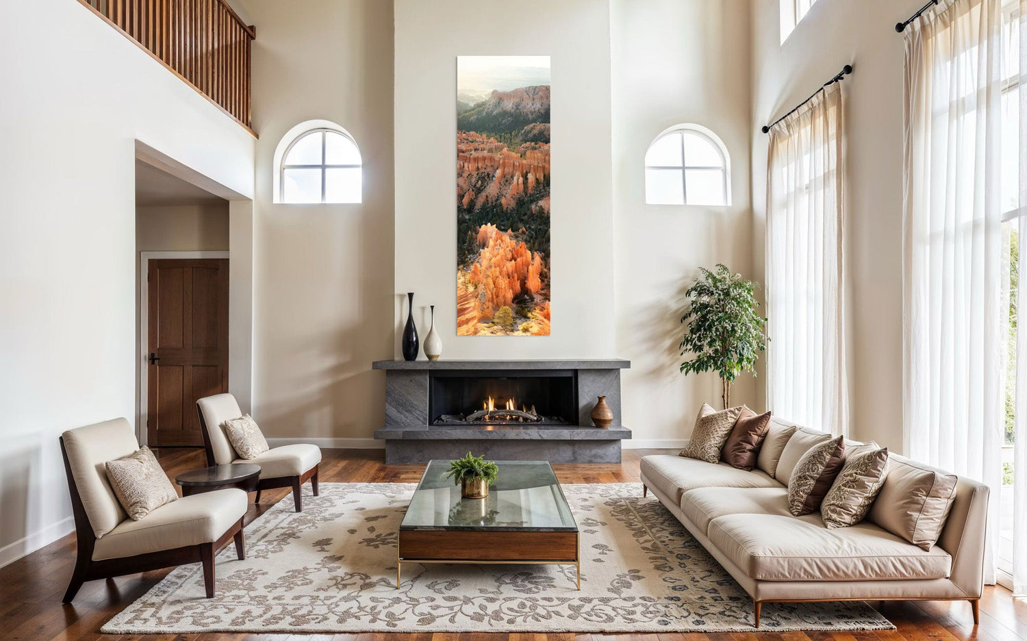A fine art photography print showing a Bryce Canyon sunrise hangs above a fireplace.