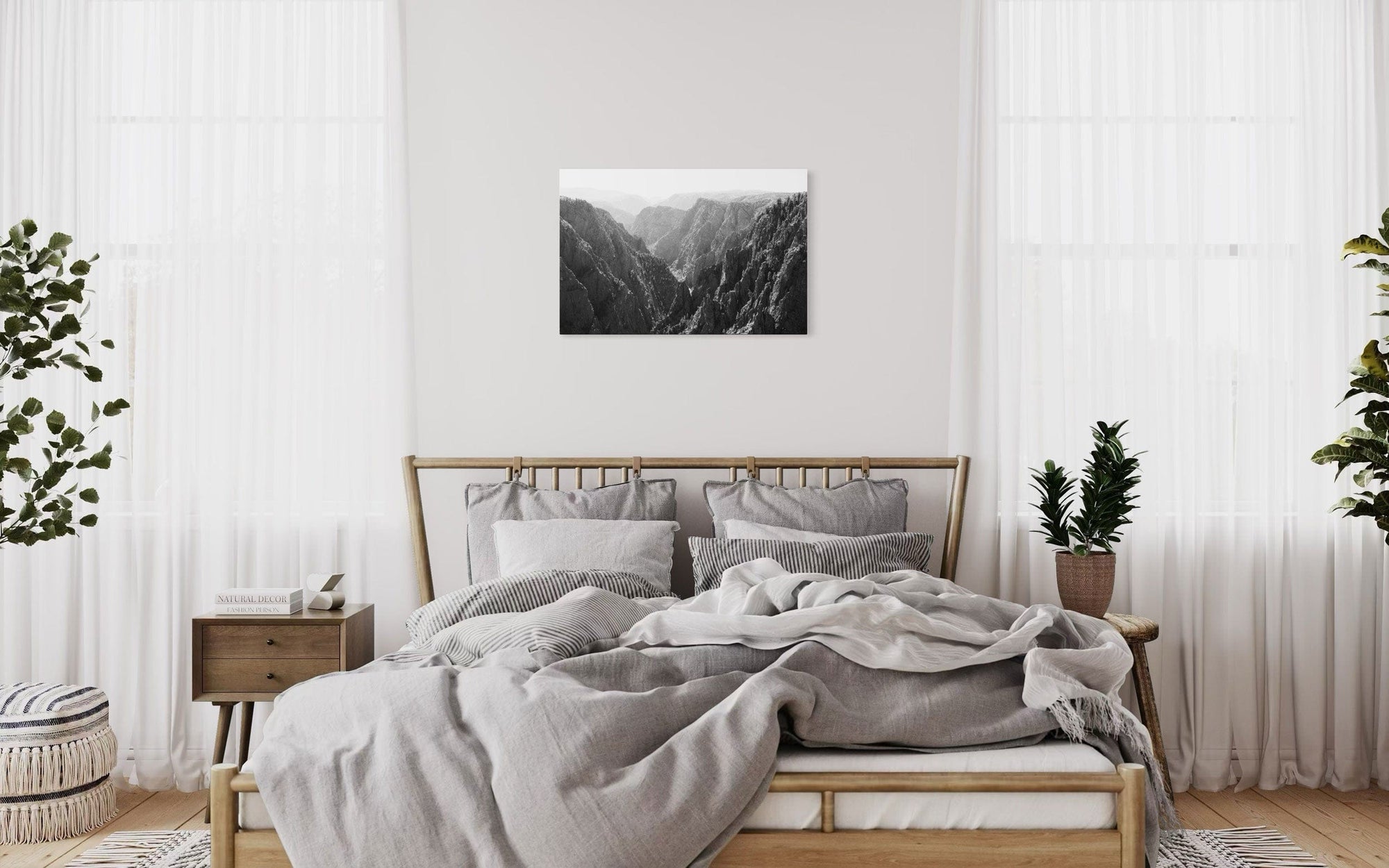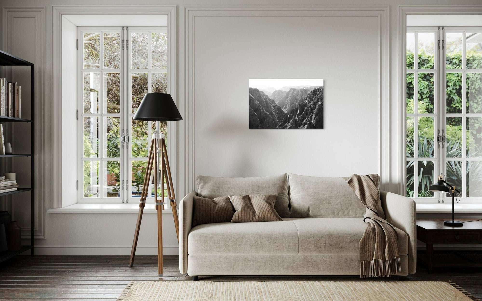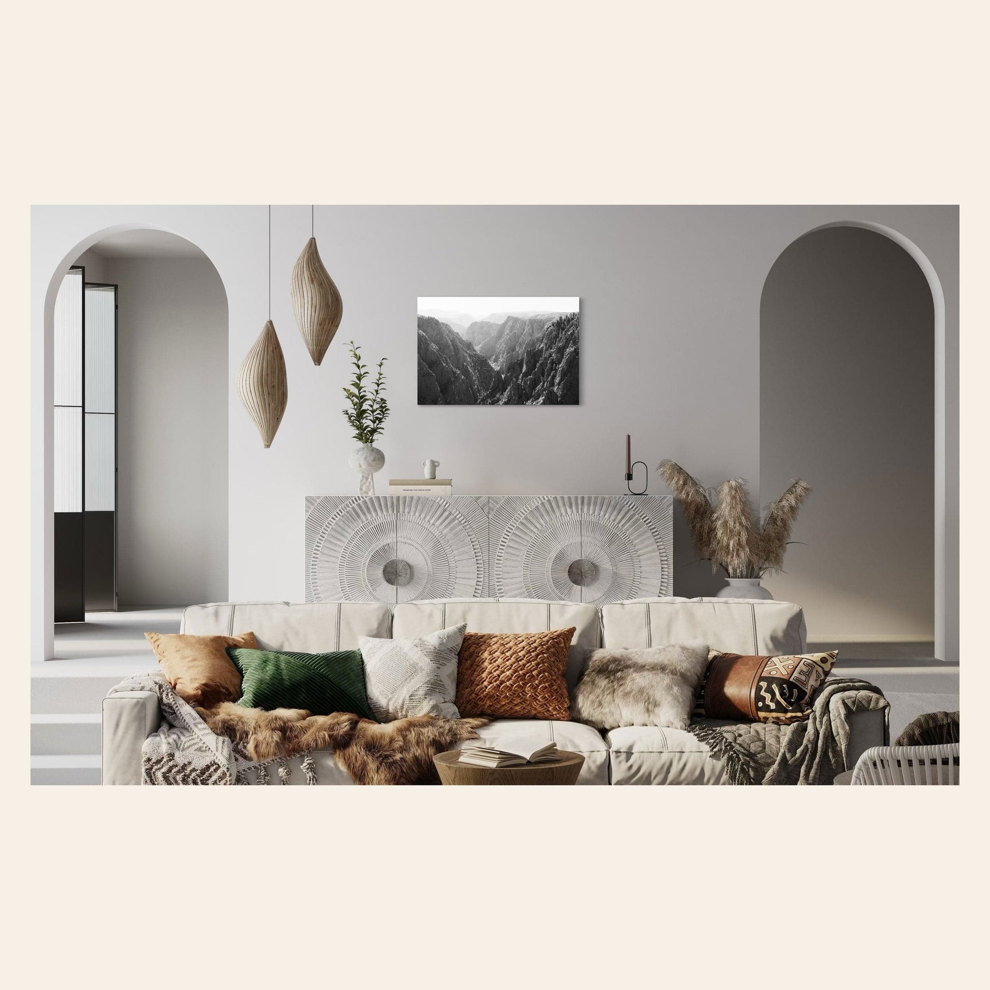 A piece of Colorado art showing a photo of the Black Canyon National Park in Gunnison hangs over a console.