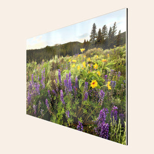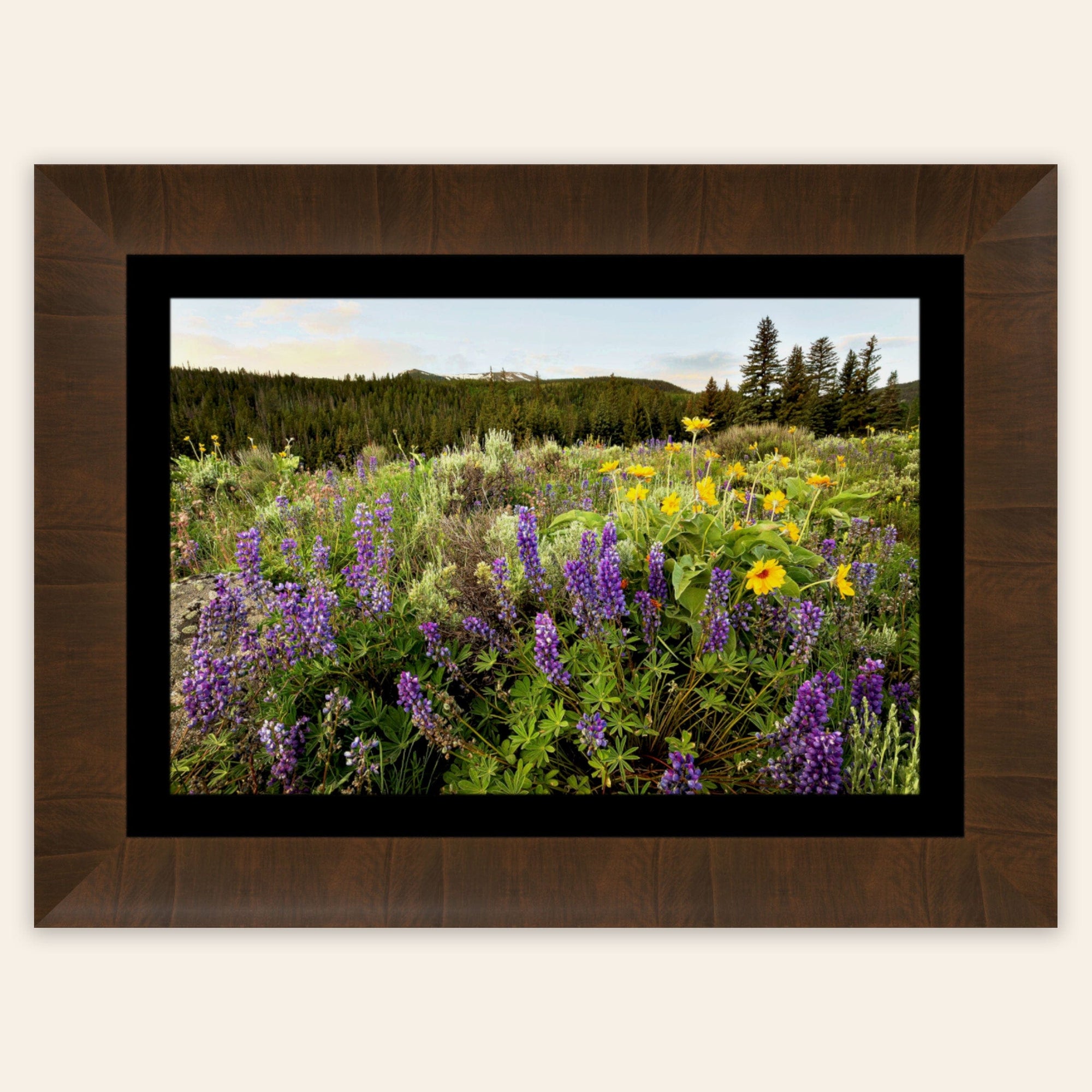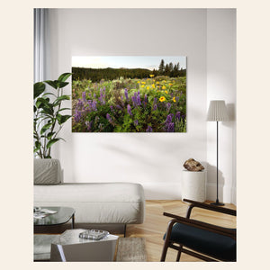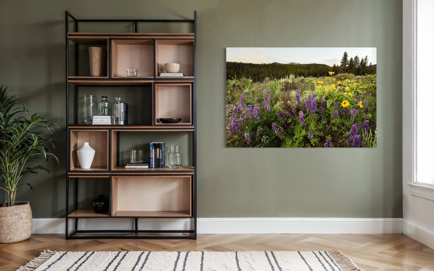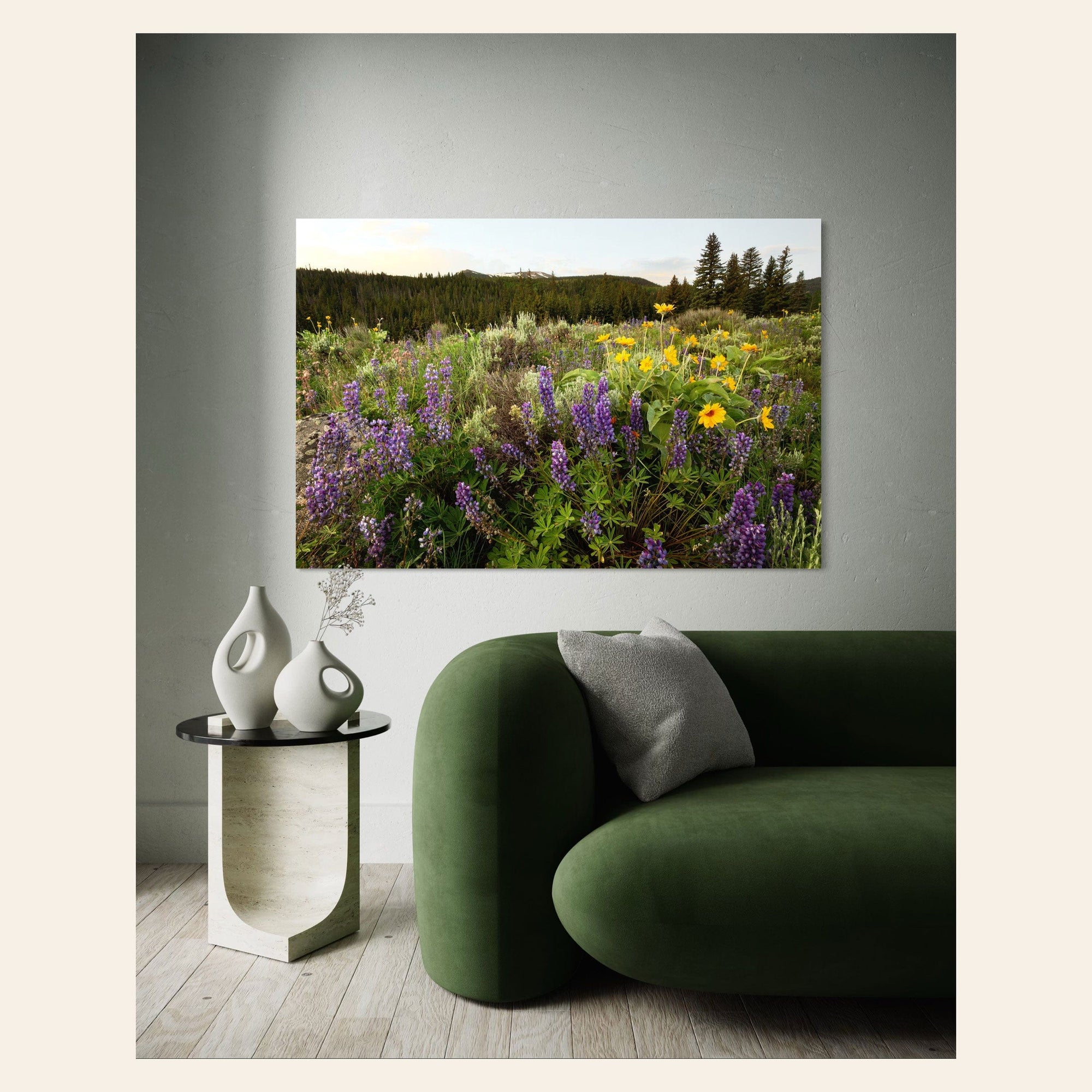 A piece of Colorado art showing a photo of wildflowers near Silverthorne hangs in a living room.