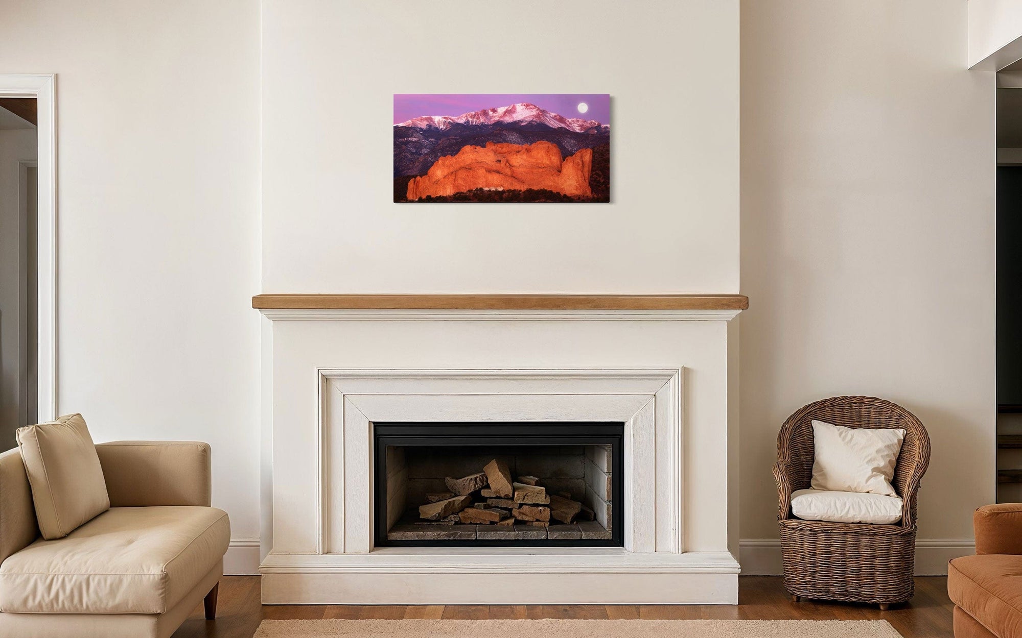 A piece of Colorado art showing a photo of Pike's Peak and the Garden of the Gods in Colorado Springs hangs above a modern firepalce.