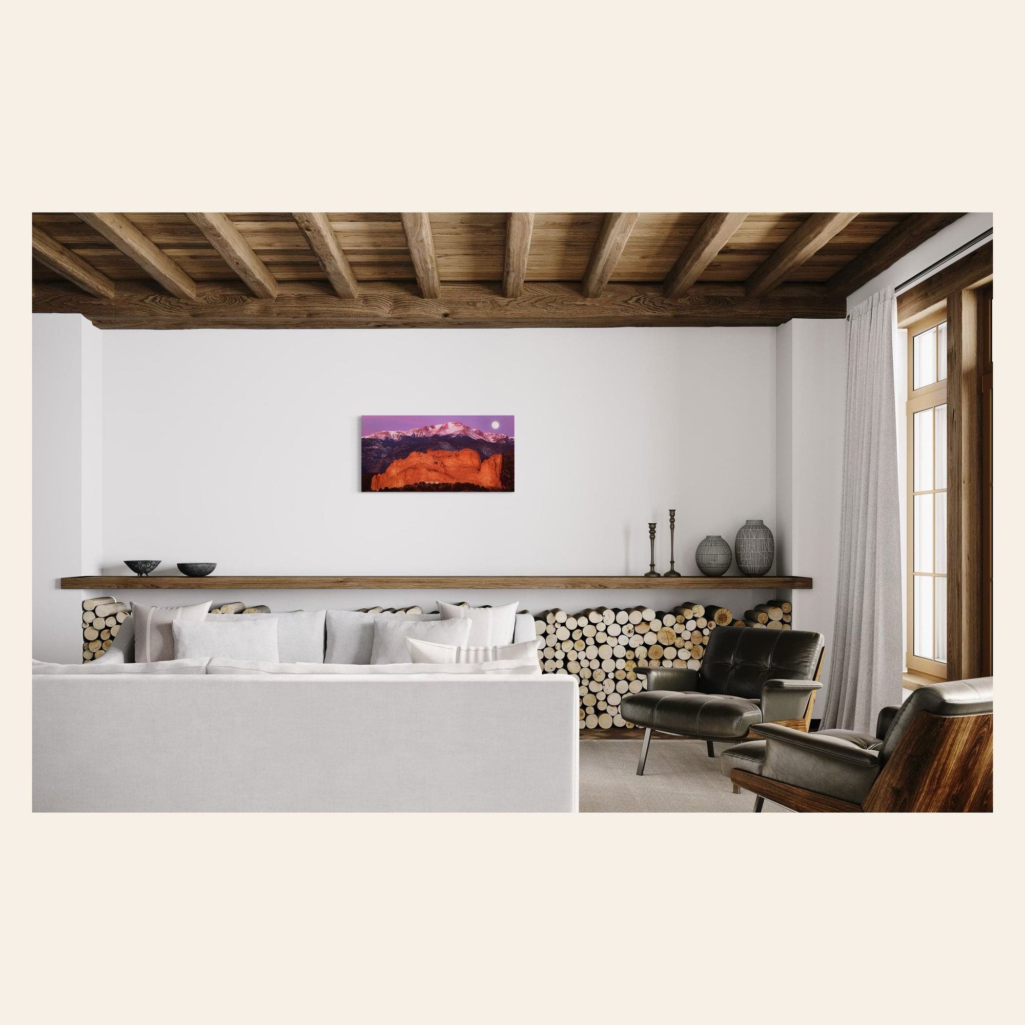 A piece of Colorado art showing a photo of Pike's Peak and the Garden of the Gods in Colorado Springs hangs in a living room.