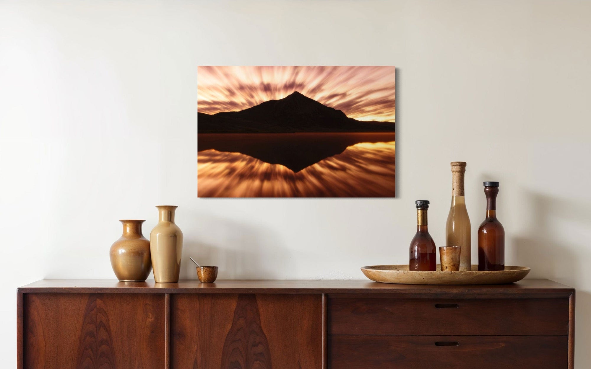 A piece of Crested Butte art showing a photo of the mountain at sunrise from Peanut Lake hangs in a modern rustic living room.