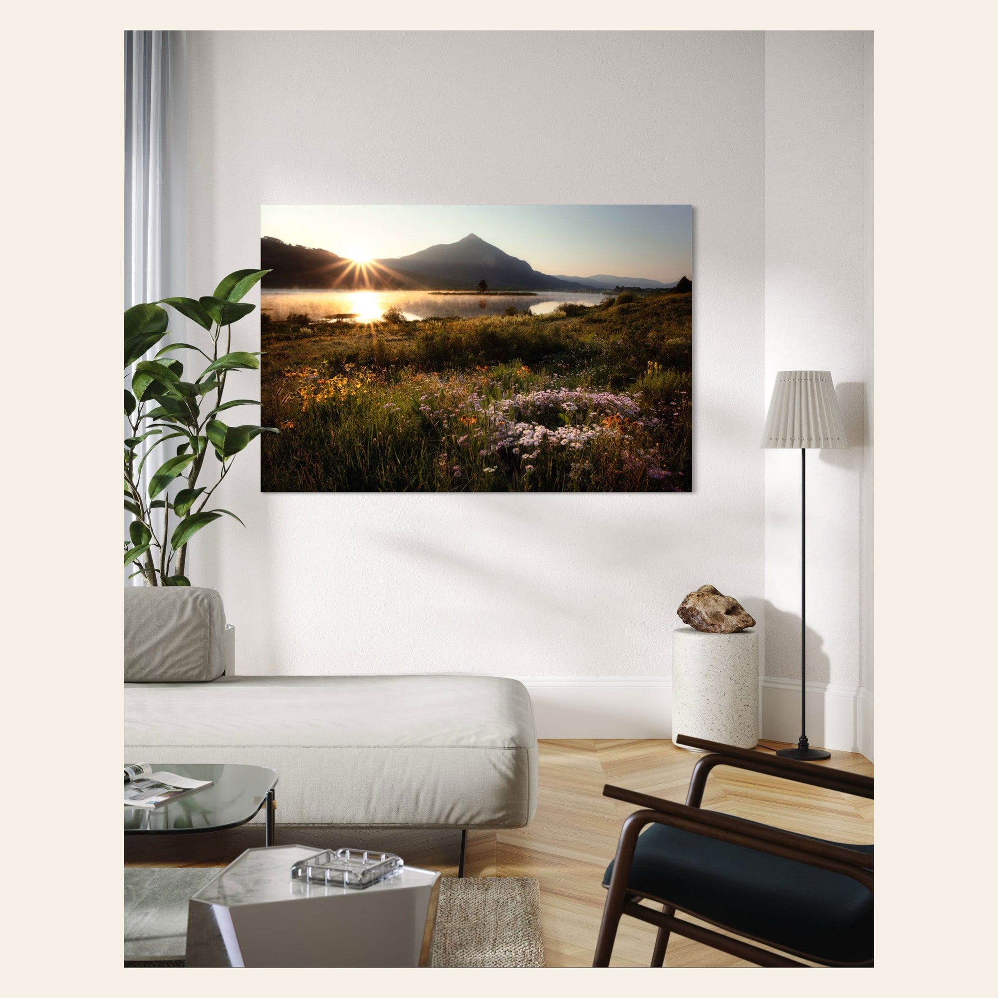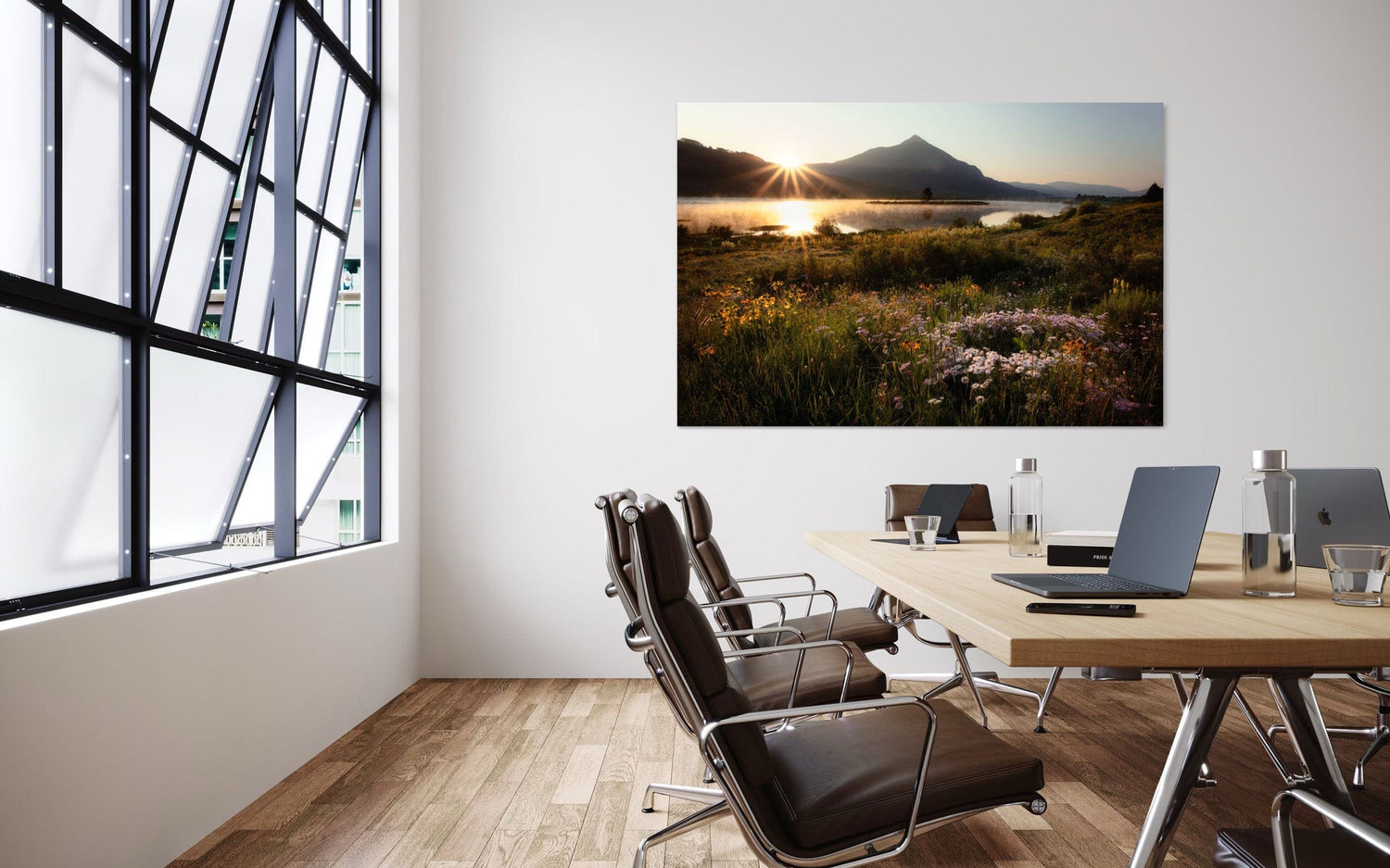 A piece of Crested Butte art showing a photo of the wildflowers in the Colorado mountain town hangs in an office.