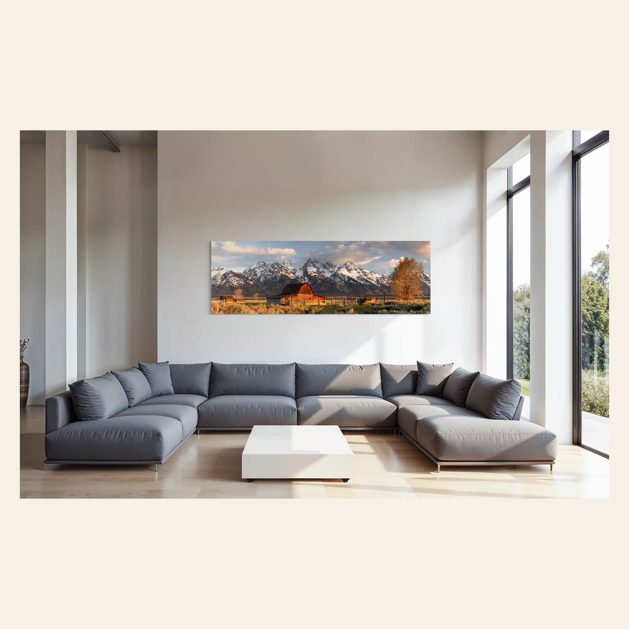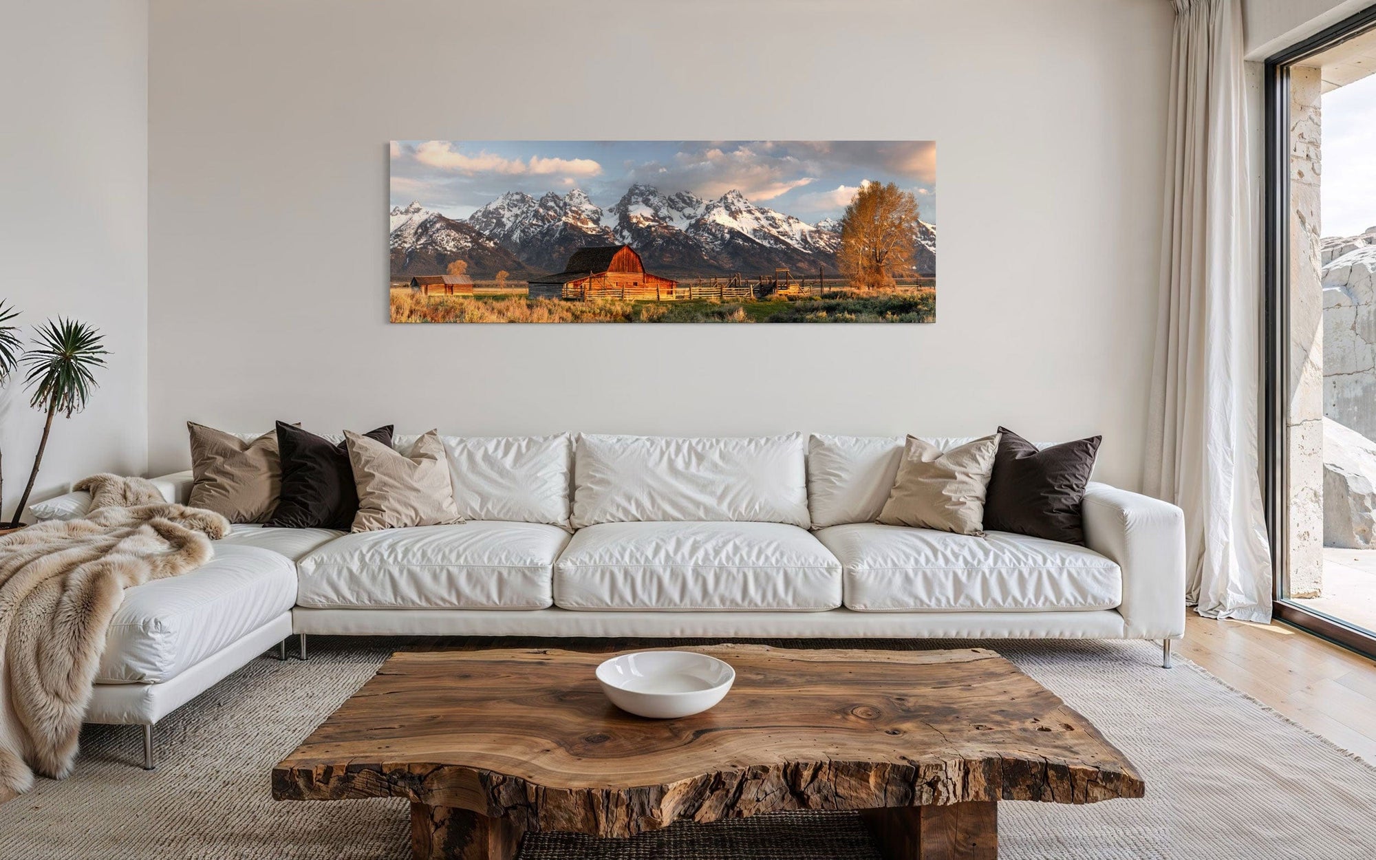 A piece of Jackson Hole art showing a photo of Mormon Row at the foot of the Grand Tetons hangs in a modern rustic living room space.