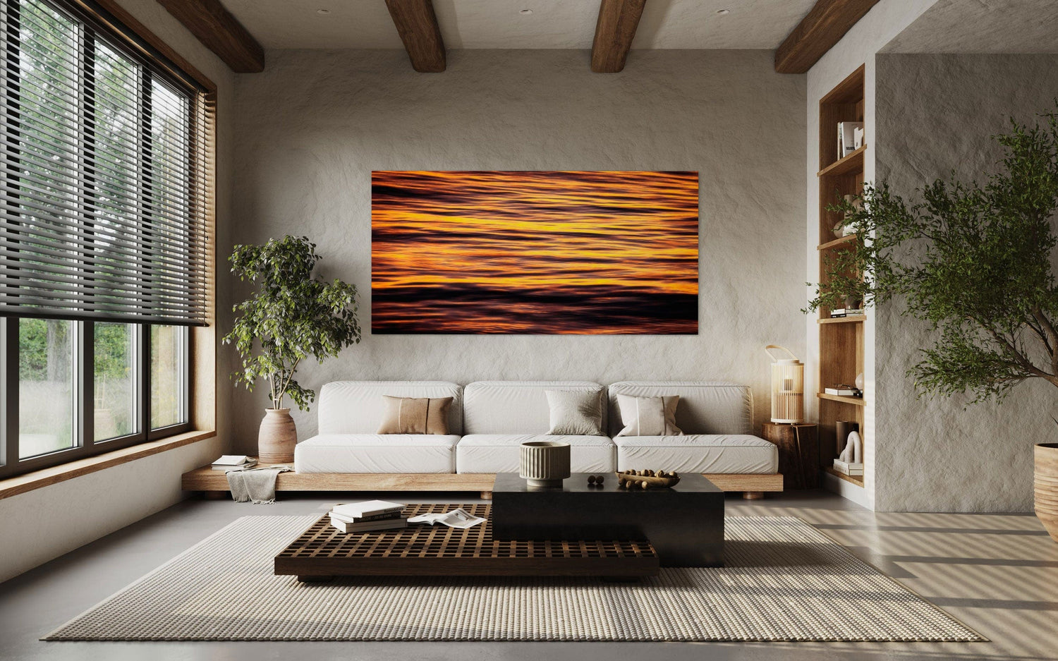 A piece of Key West art showing a sunset beach photo hangs in a living room.