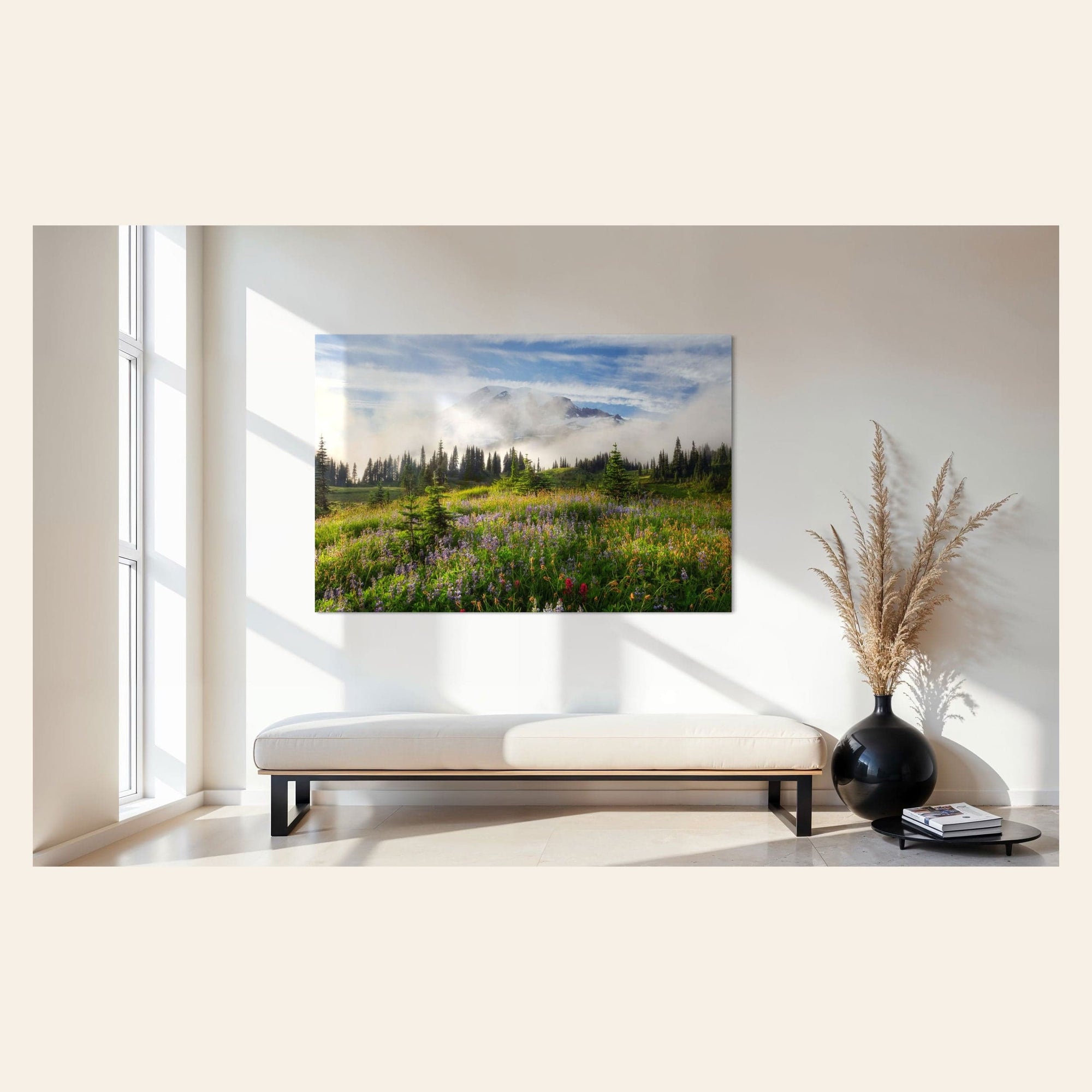 A piece of Mount Rainier art showing a wildflower photo at Paradise hangs above a couch.