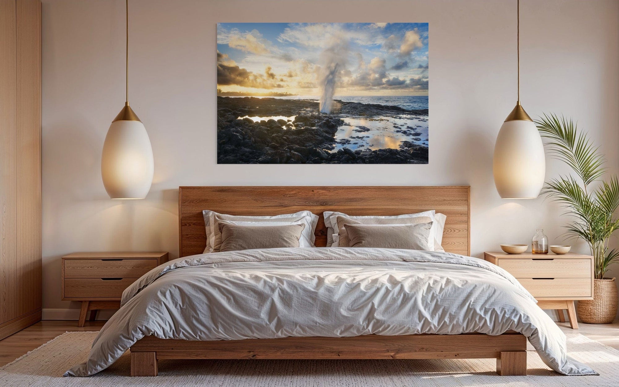 A piece of Kauai art showing a Spouting Horn photo hangs above a bed.