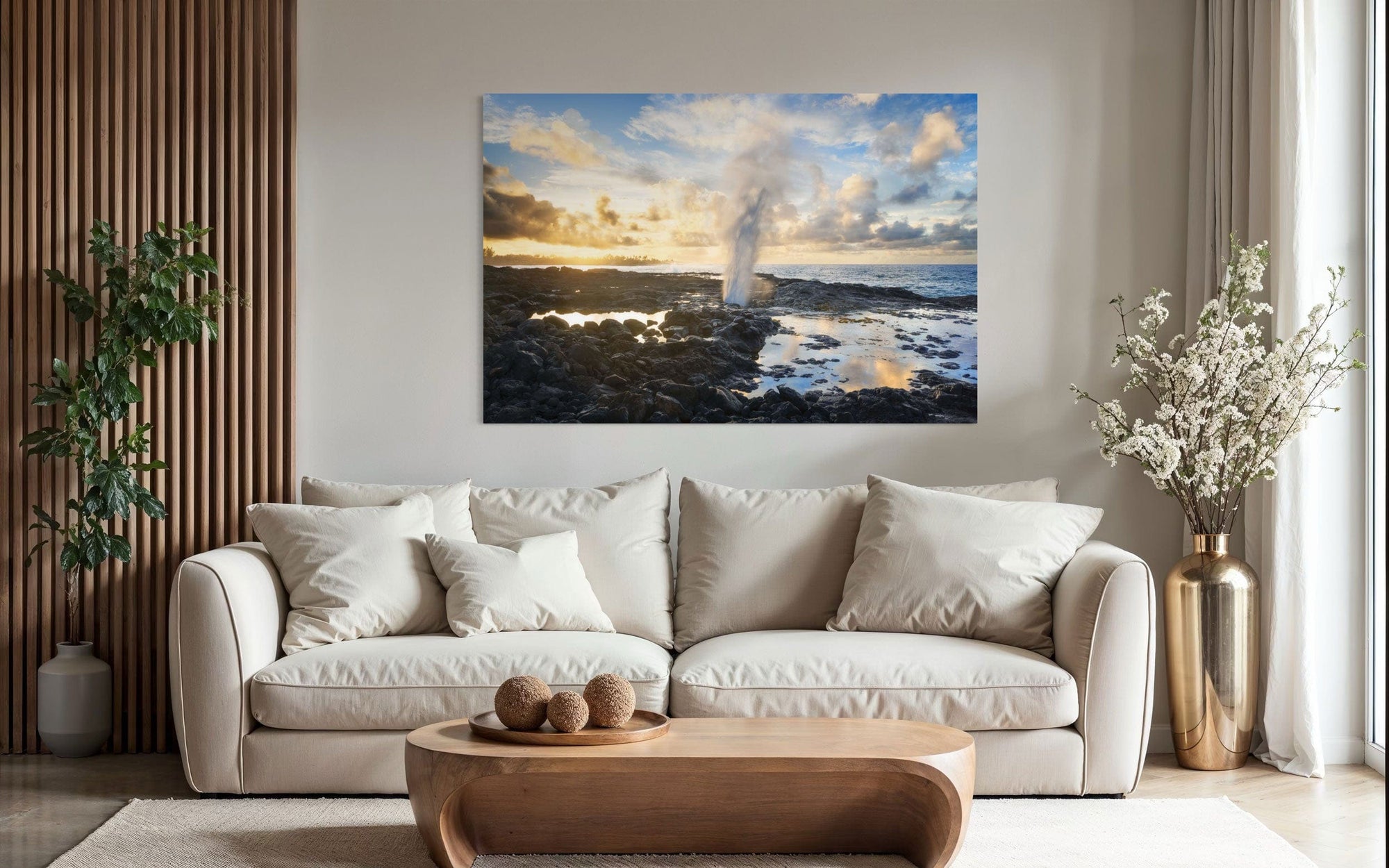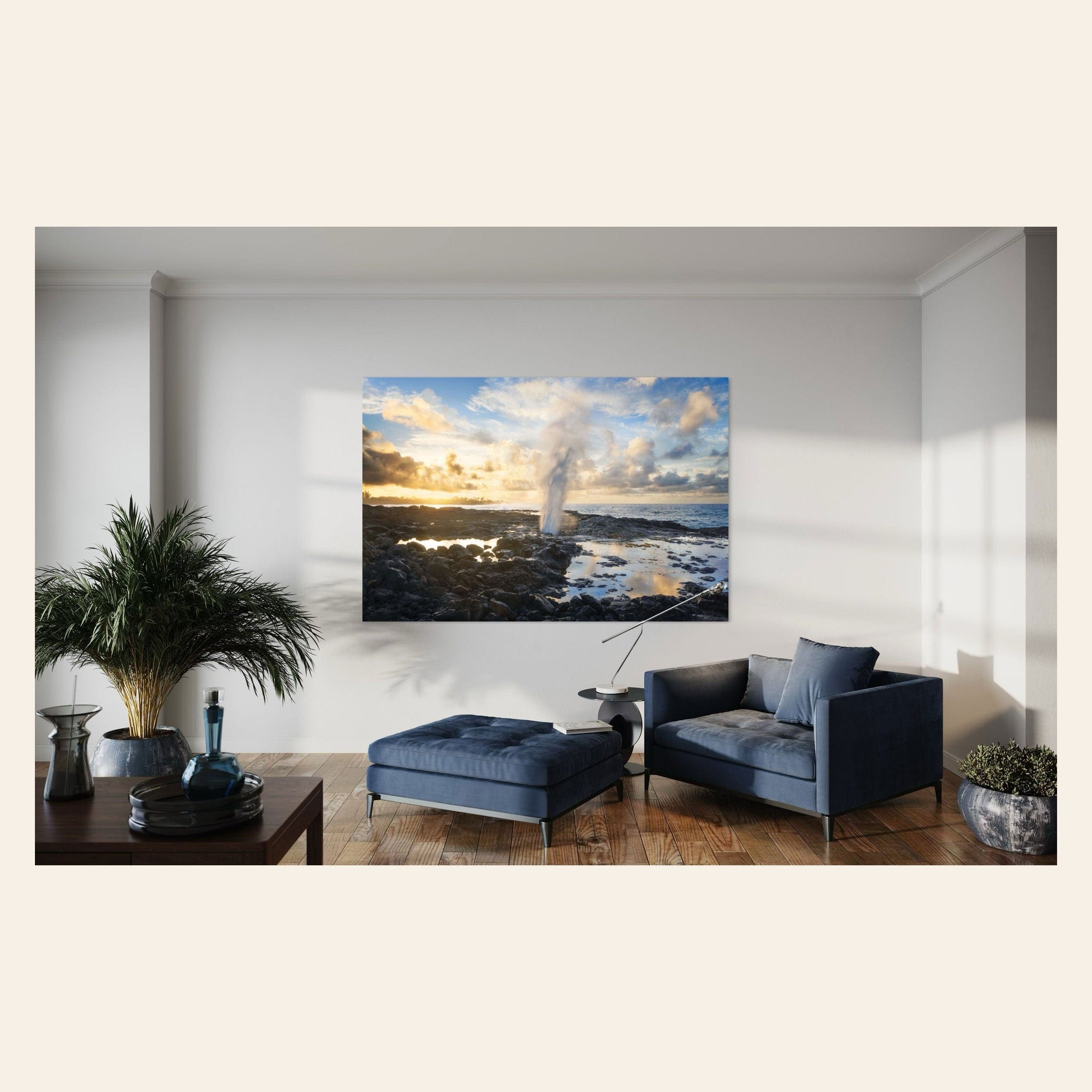A piece of Kauai art showing a Spouting Horn photo hangs in a sitting area.