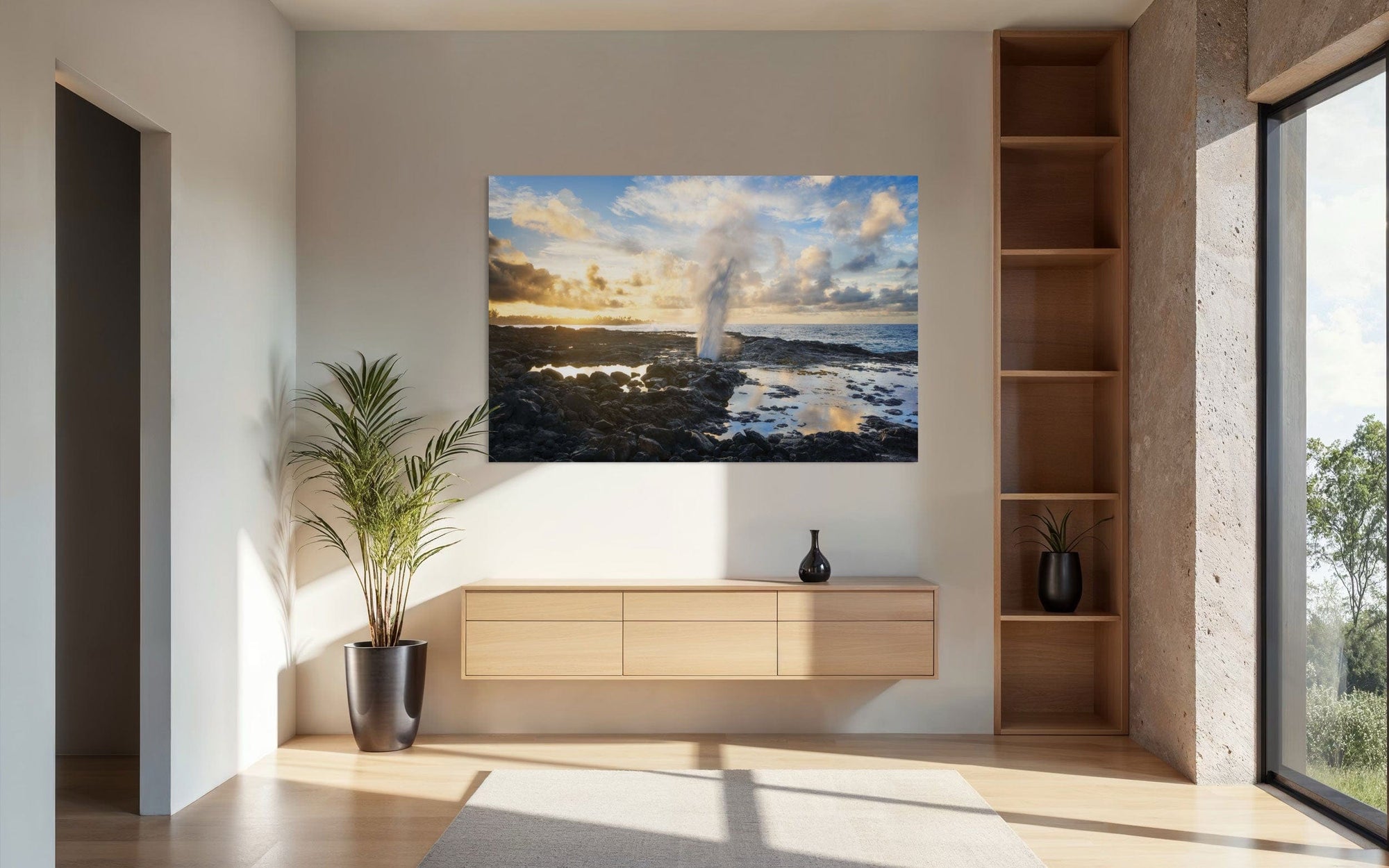 A piece of Kauai art showing a Spouting Horn photo hangs in an entryway.