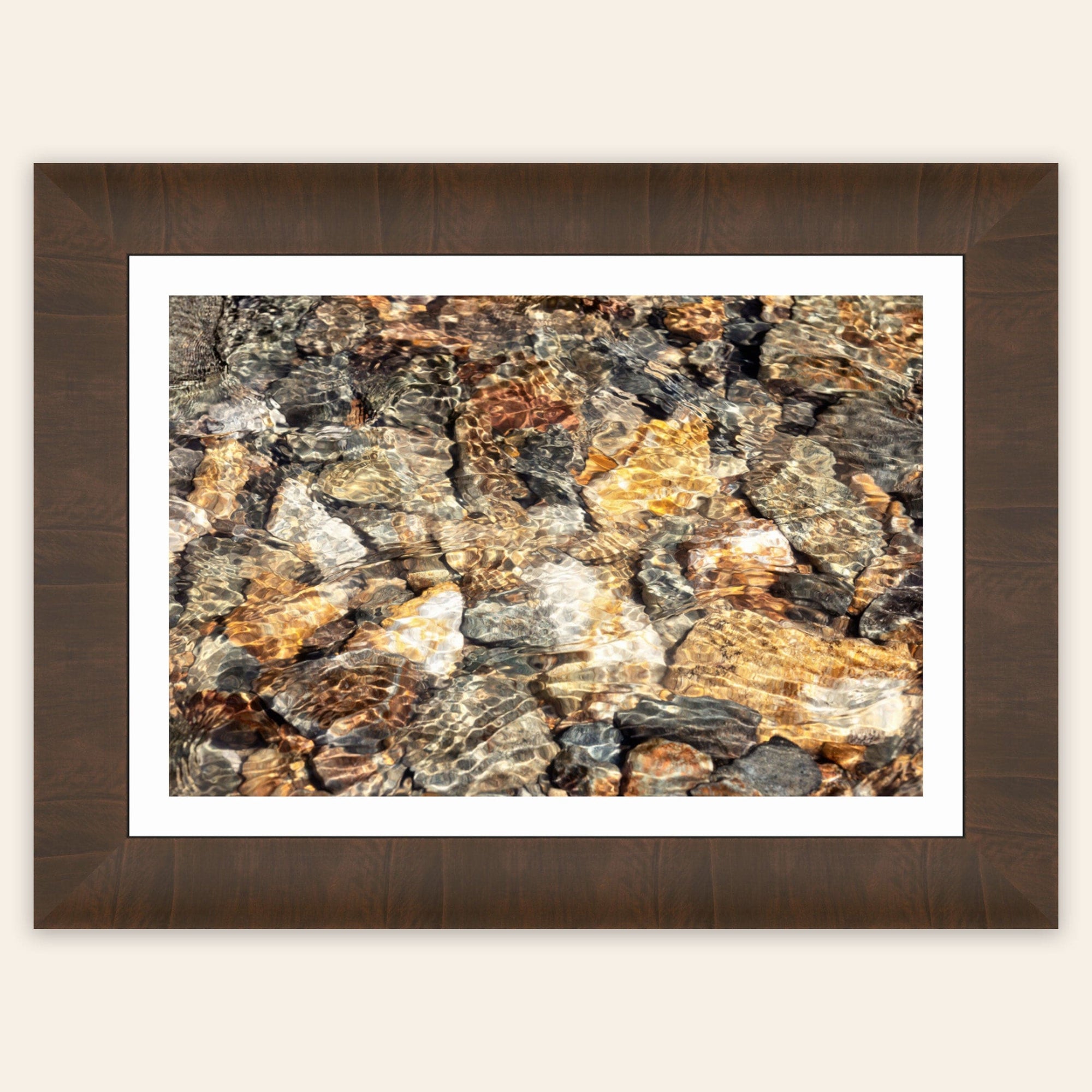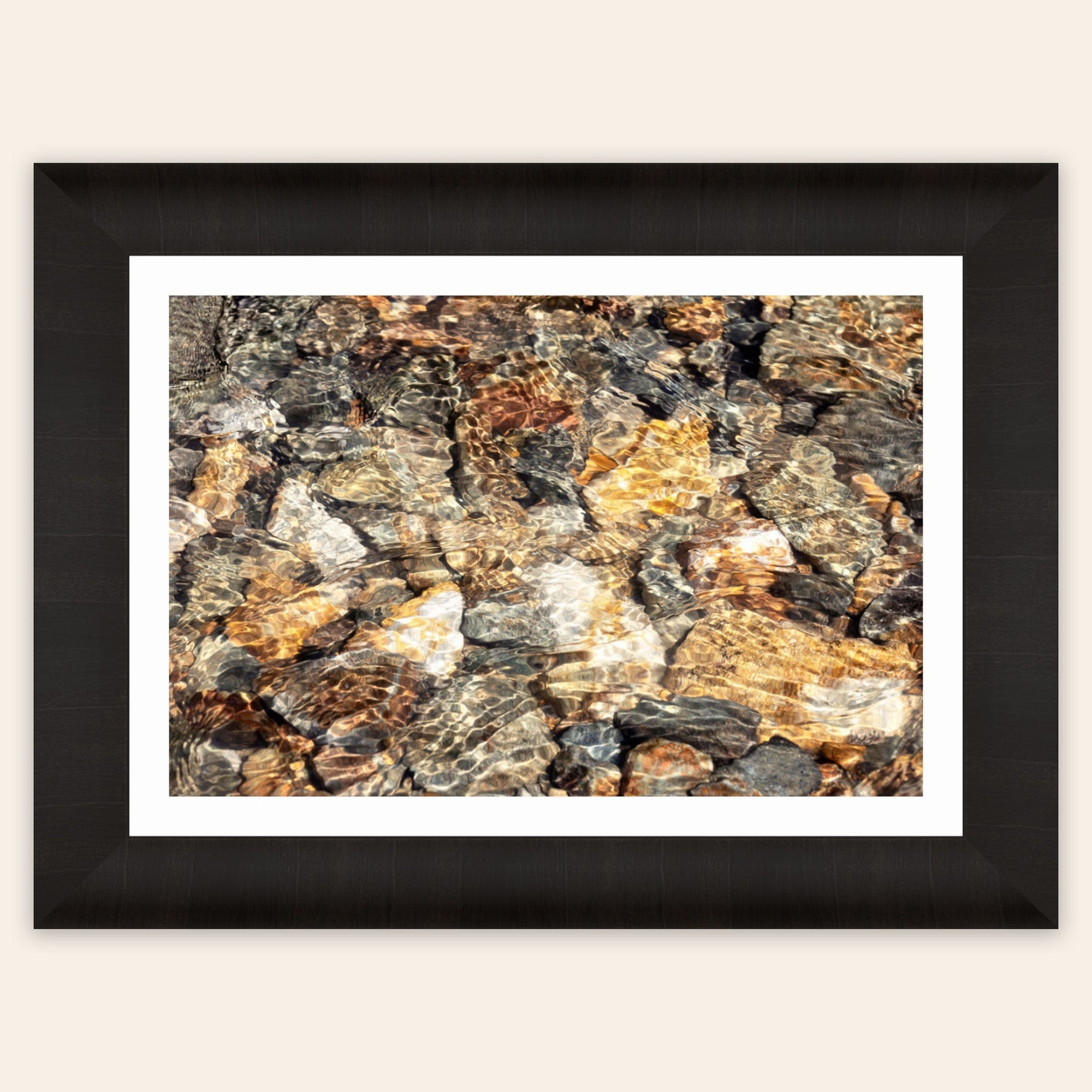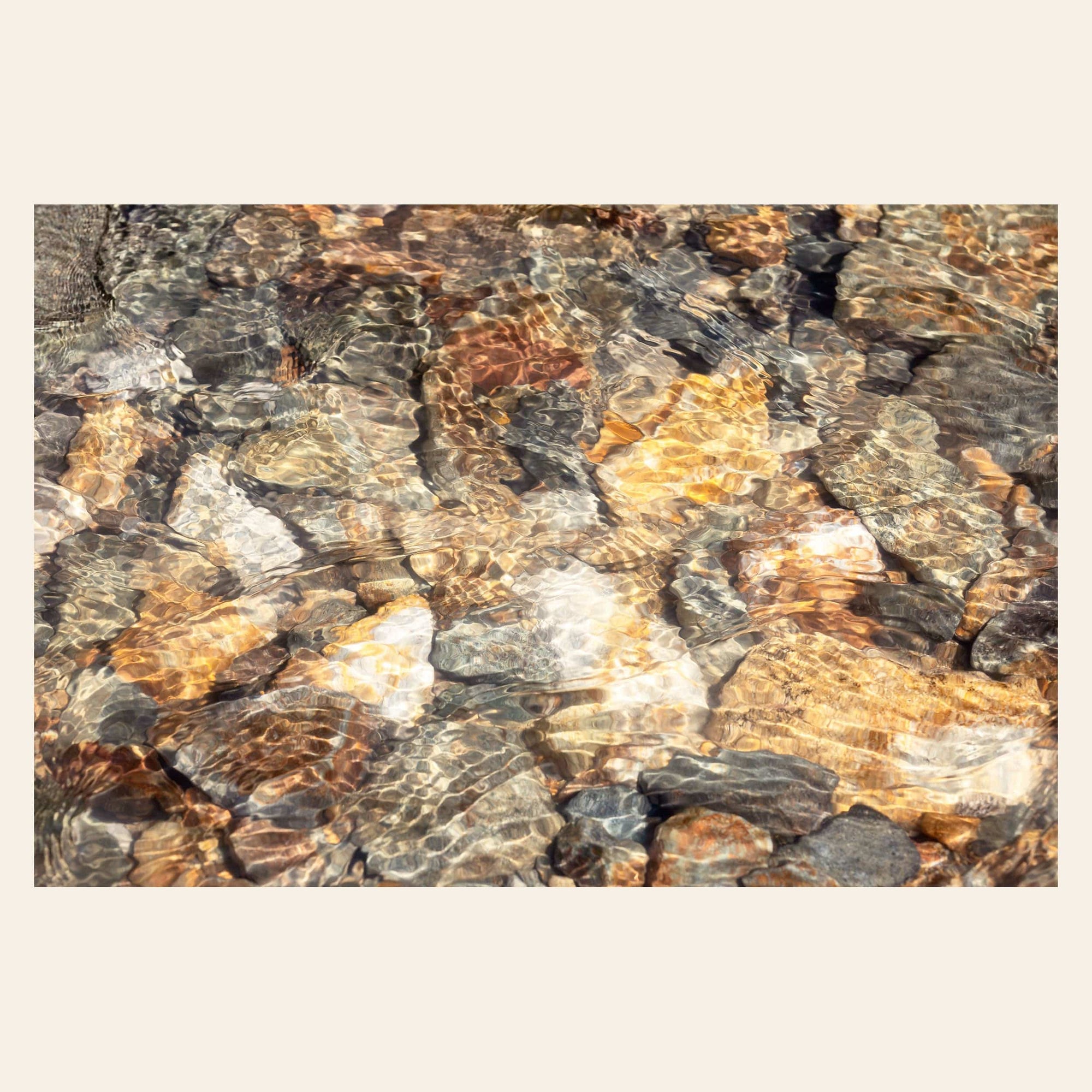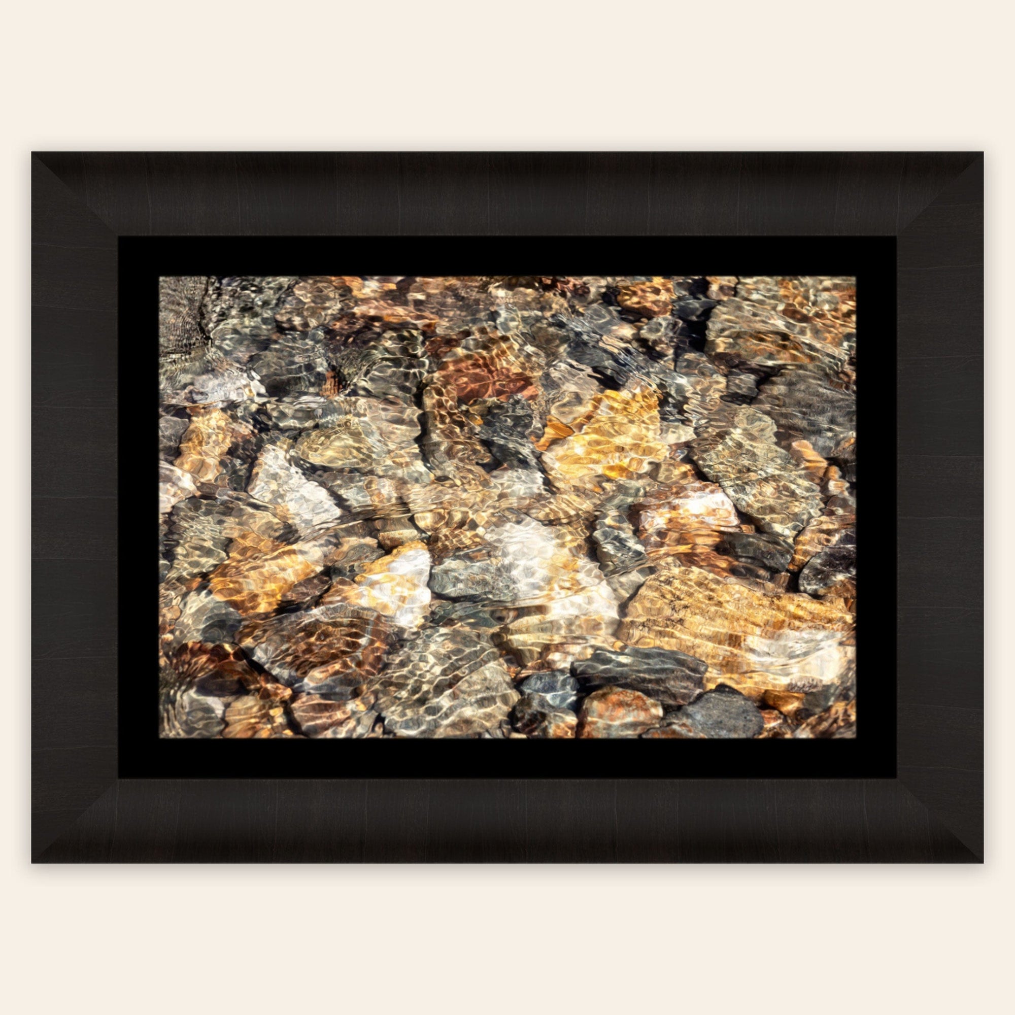 This piece of Telluride art shows glistening rocks in a Colorado River.