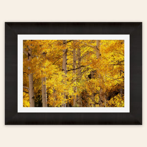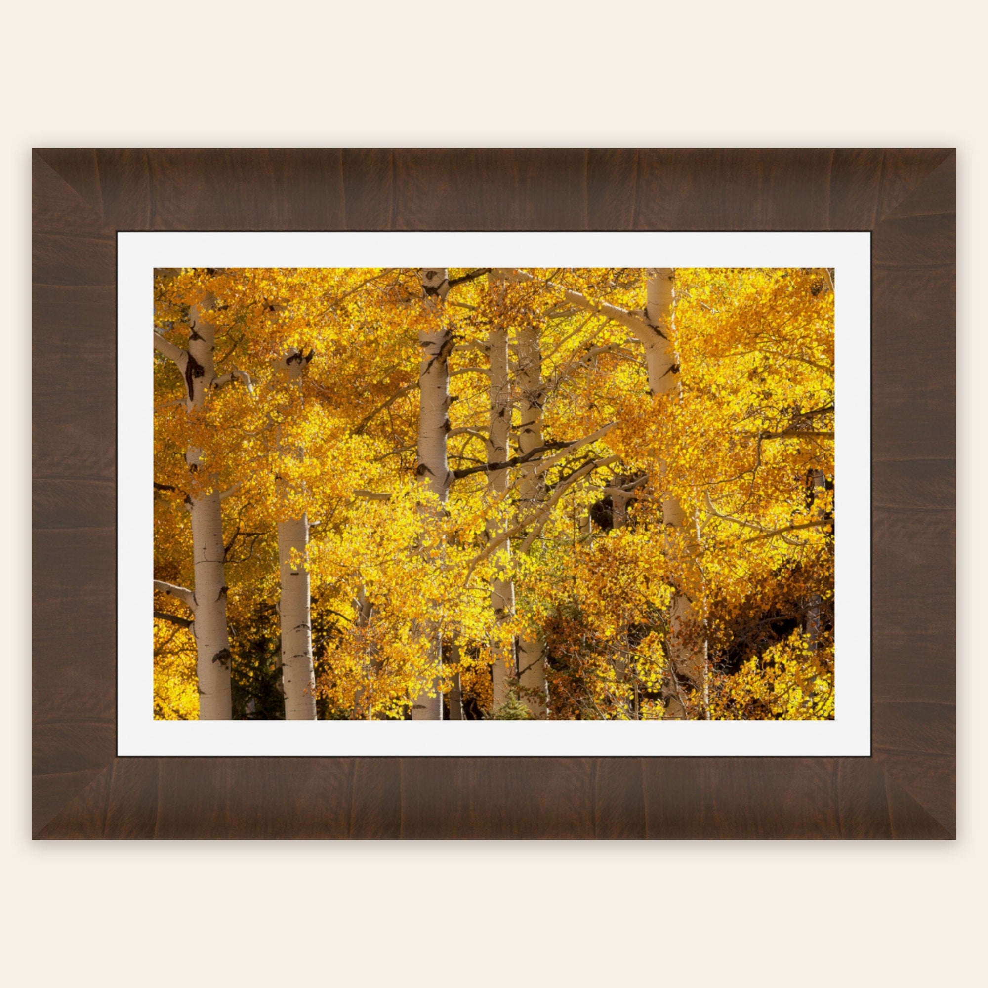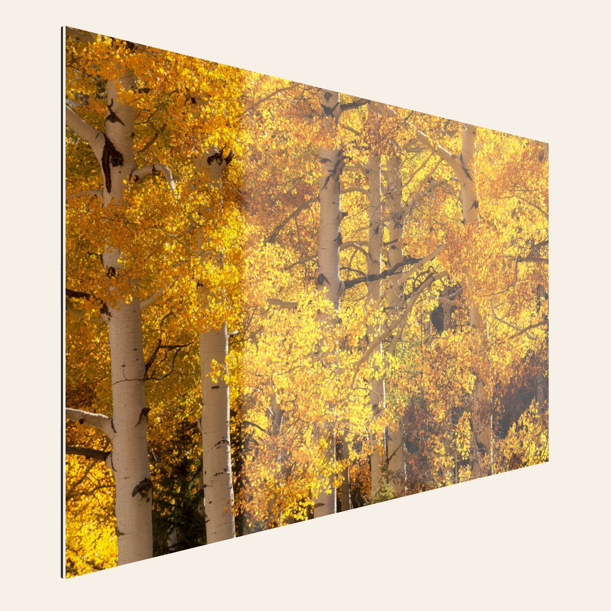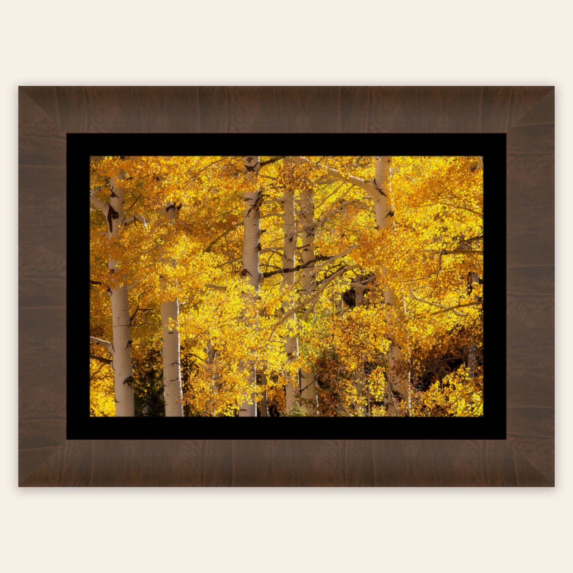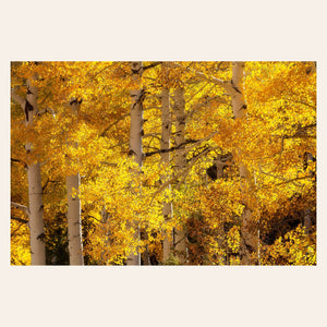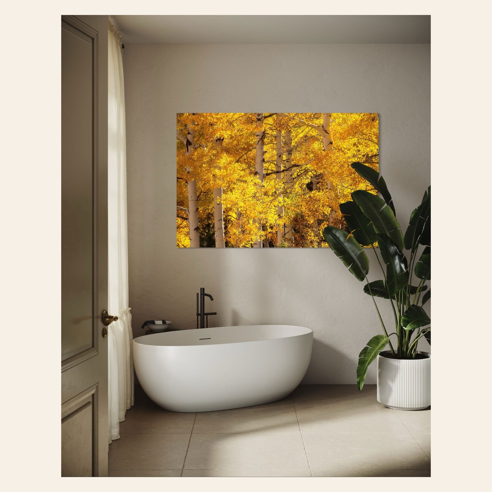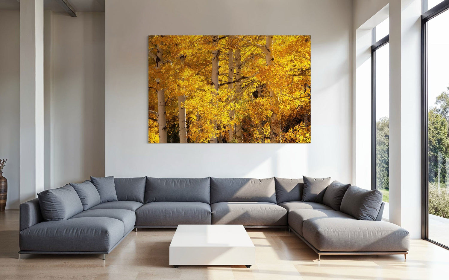 A piece of Telluride art showing a photo of an aspen tree in full fall color hangs in a living room.