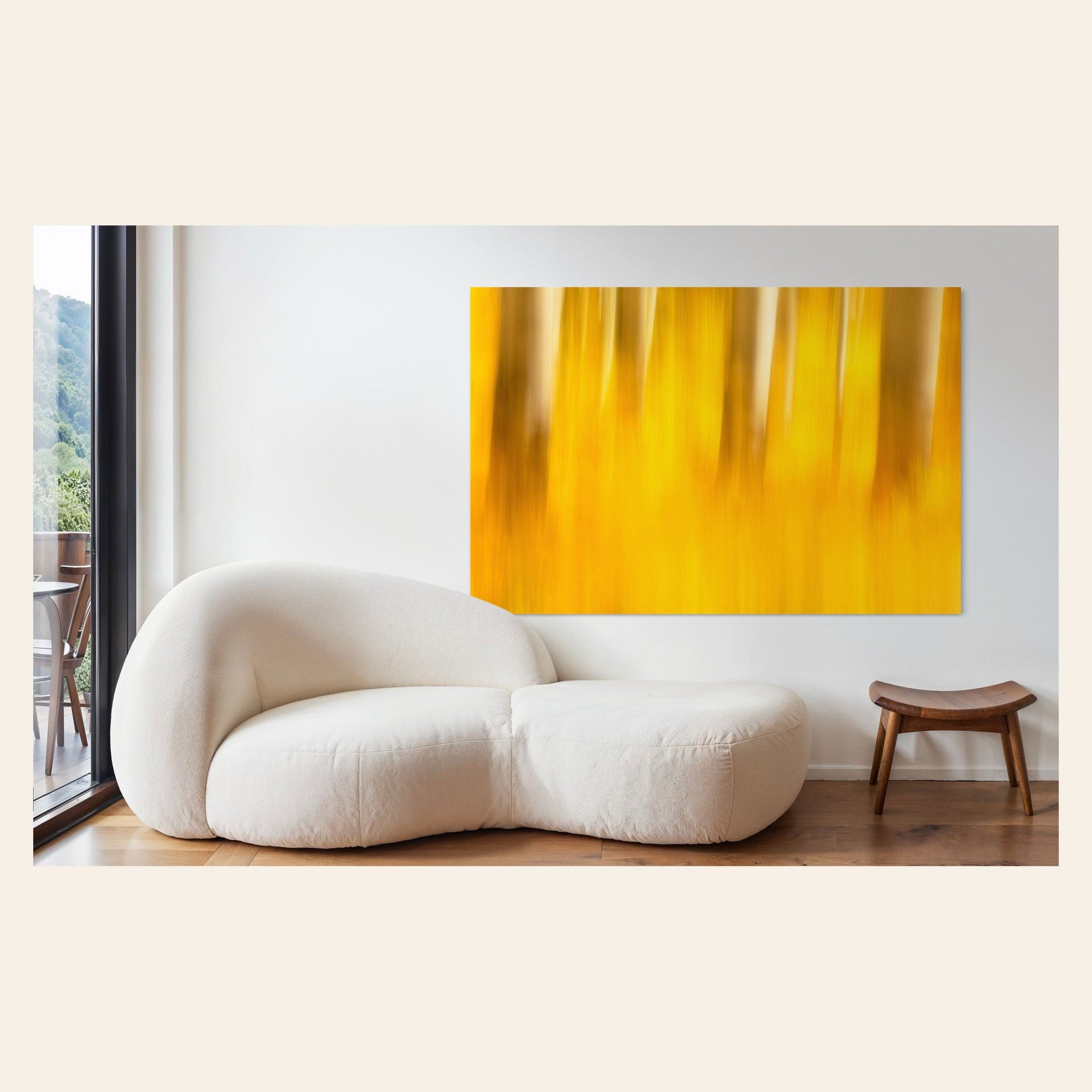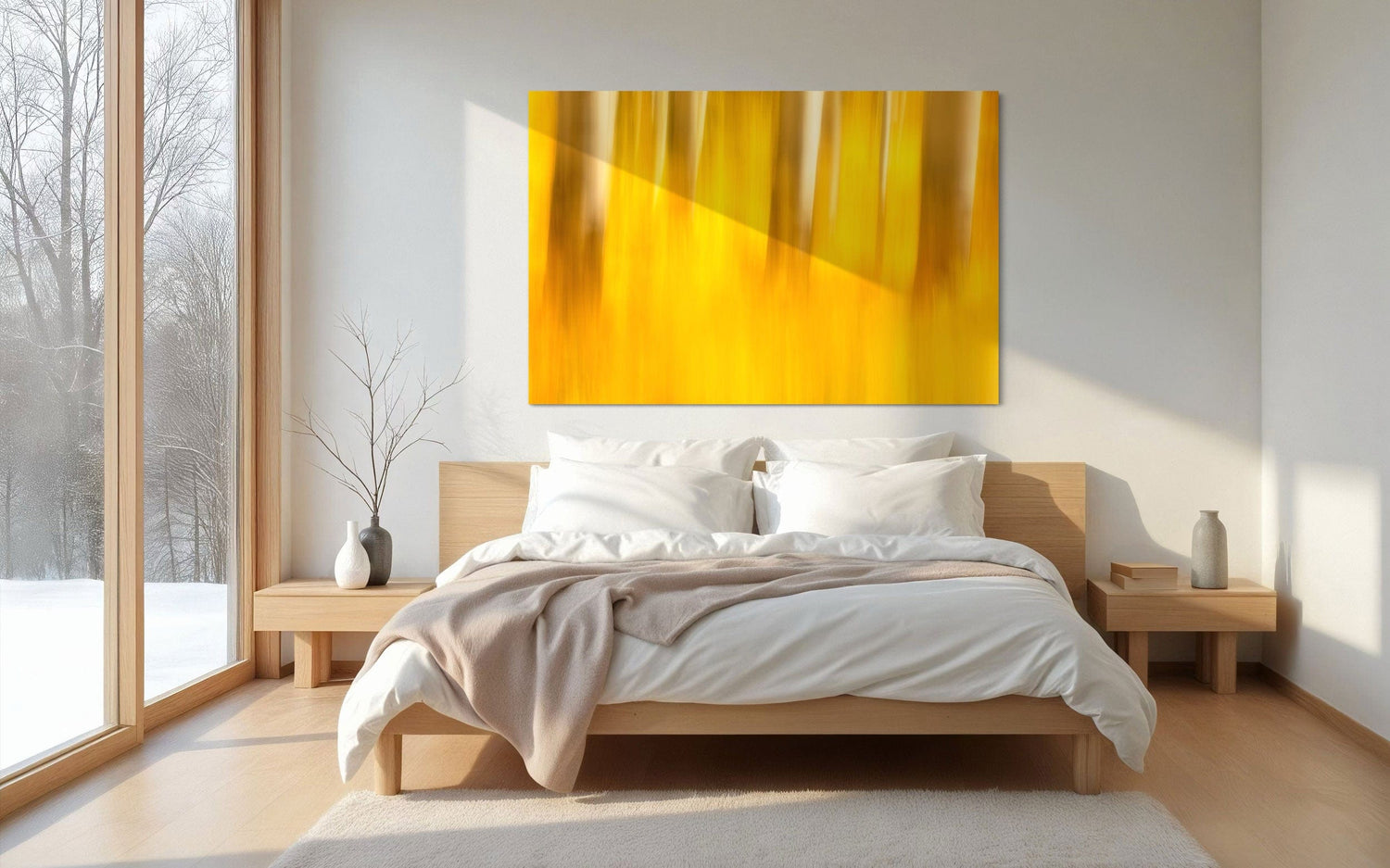 A piece of abstract art showing a photo of the Telluride fall colors on Last Dollar Road hangs in a bedroom.