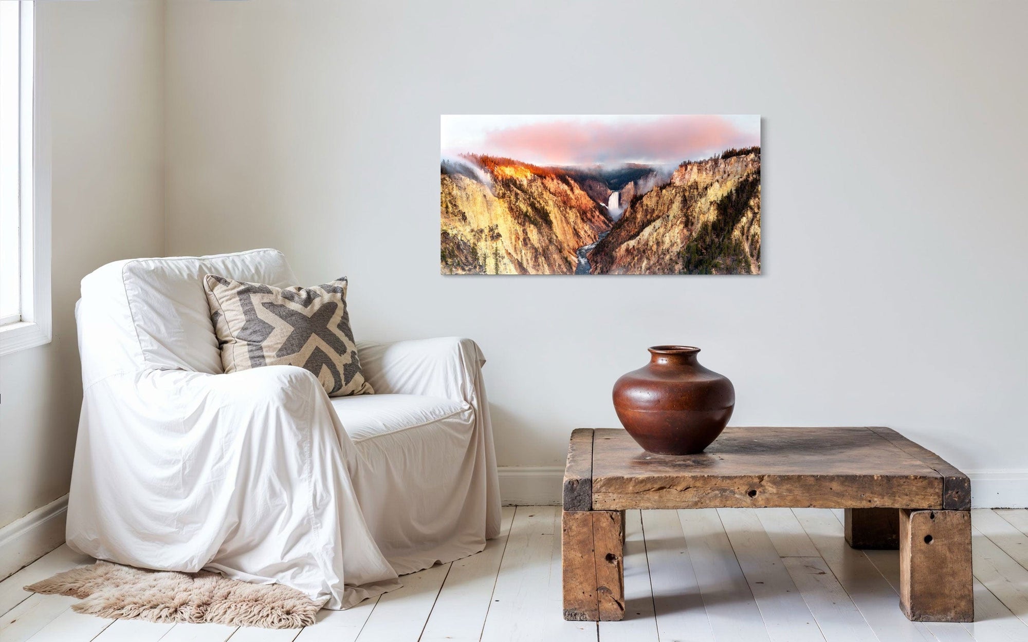A piece of Yellowstone art showing a canyon photo from Artist Point hangs in a bedroom.