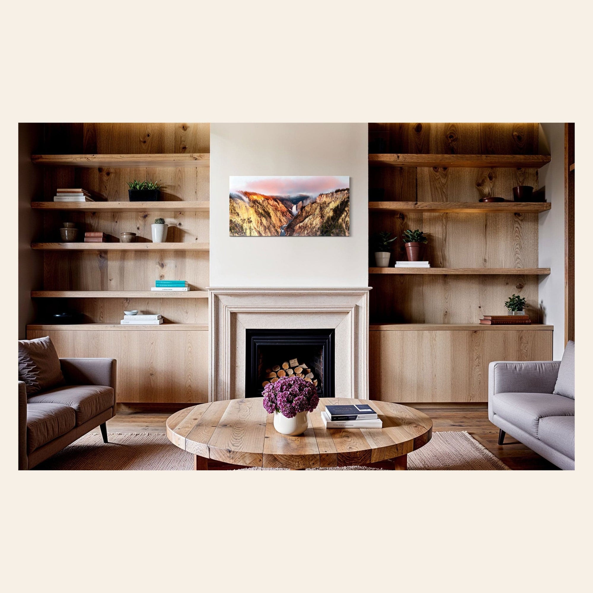 A piece of Yellowstone art showing a canyon photo from Artist Point hangs above a fireplace mantel.