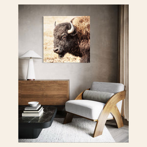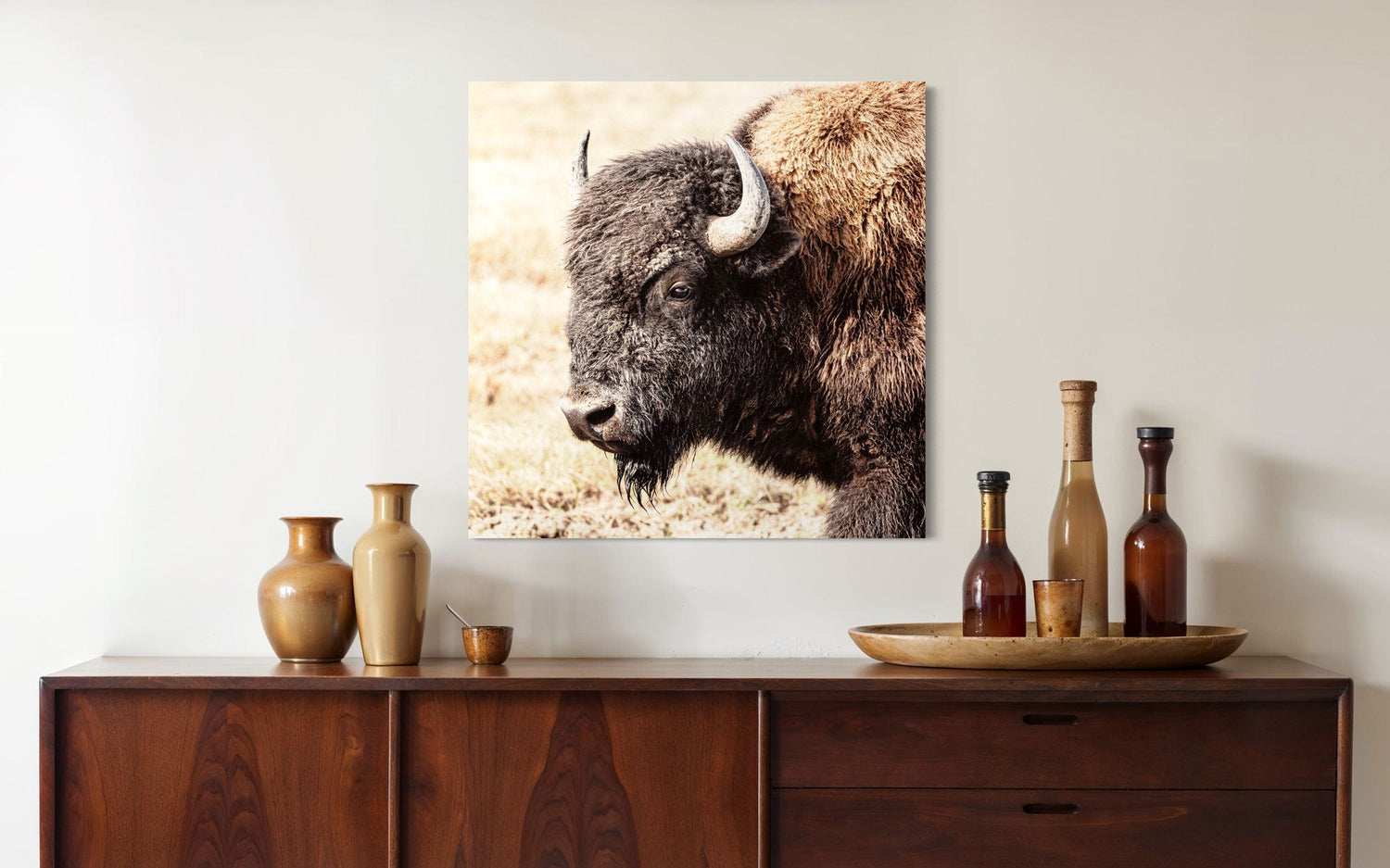 This piece of Yellowstone art shows a photo of a bison hanging over a console.