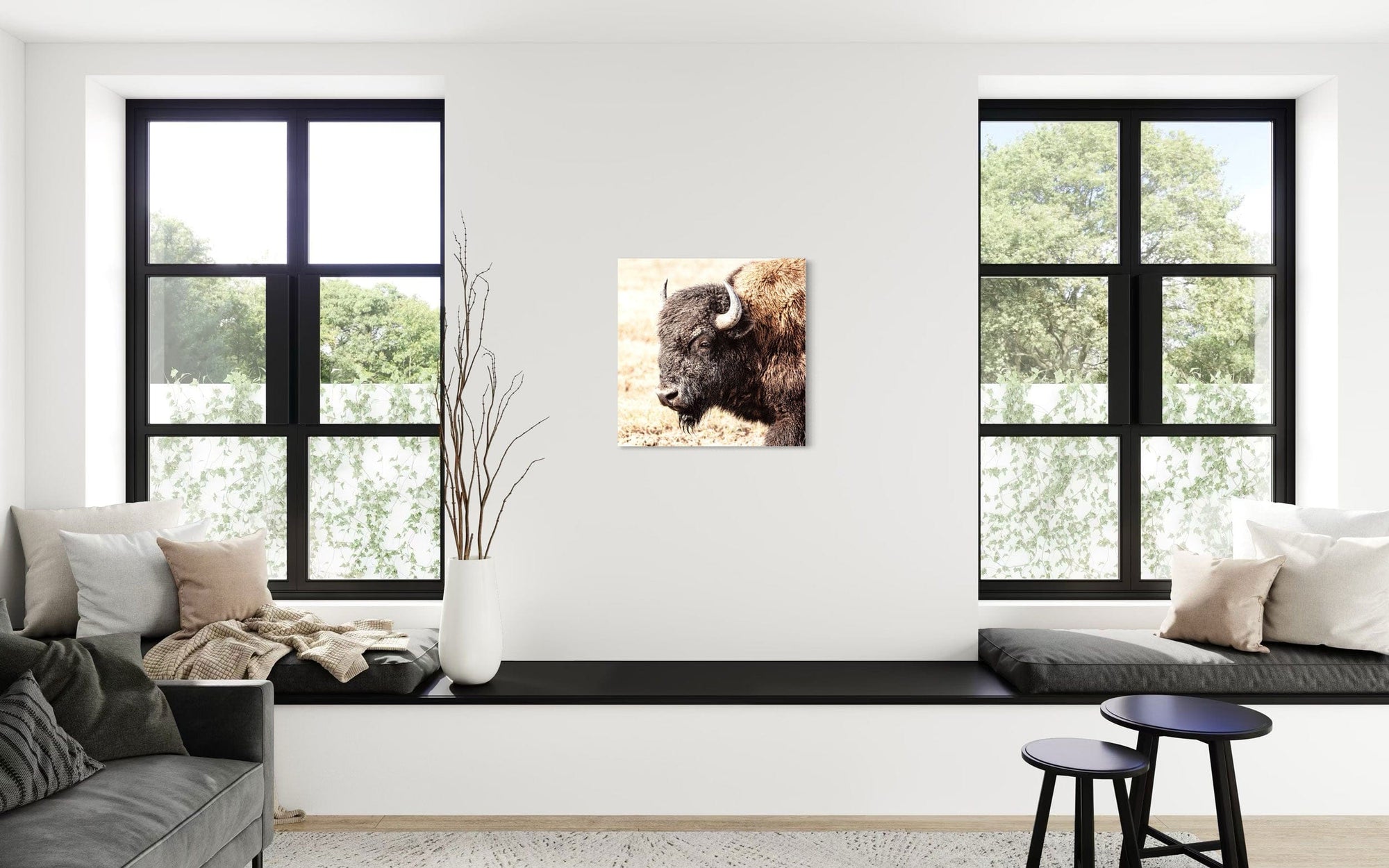 A piece of Yellowstone art showing a photo of a bison hangs in a rustic living room.
