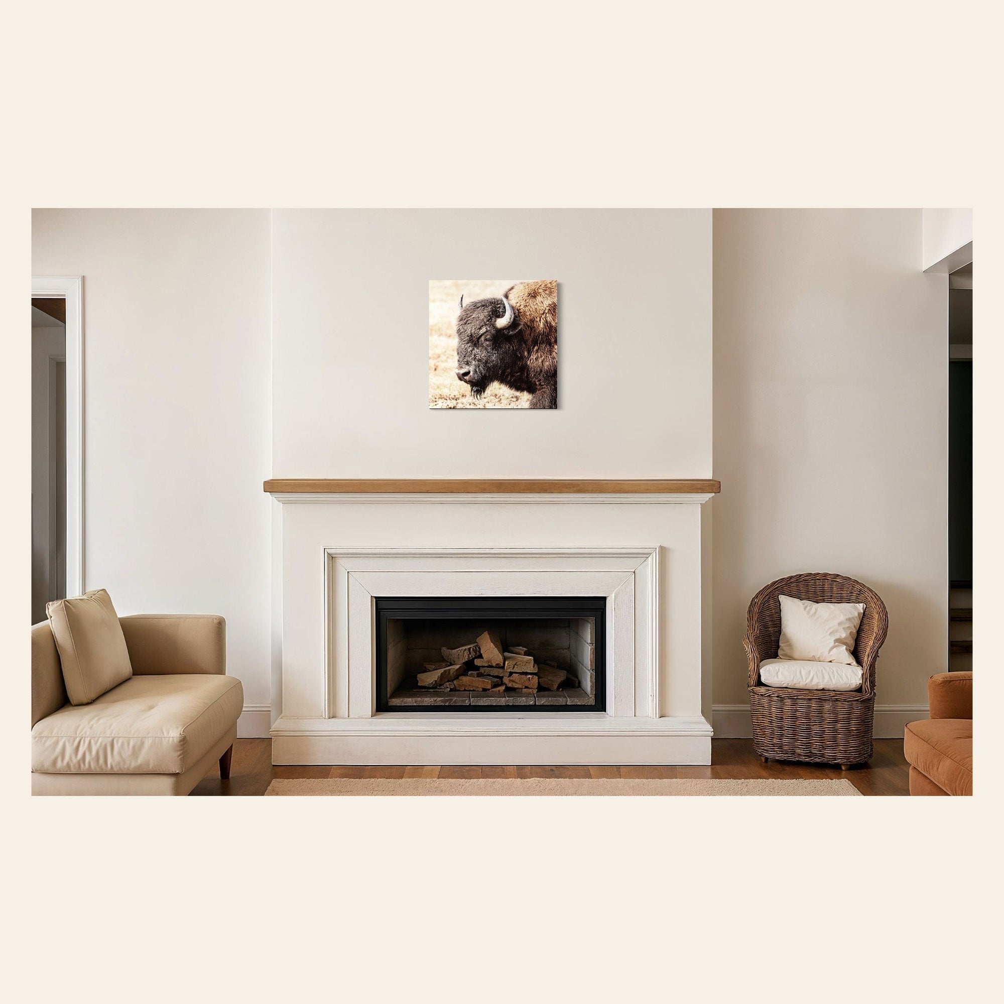 A piece of Yellowstone art showing a photo of a bison hangs over a fireplace.